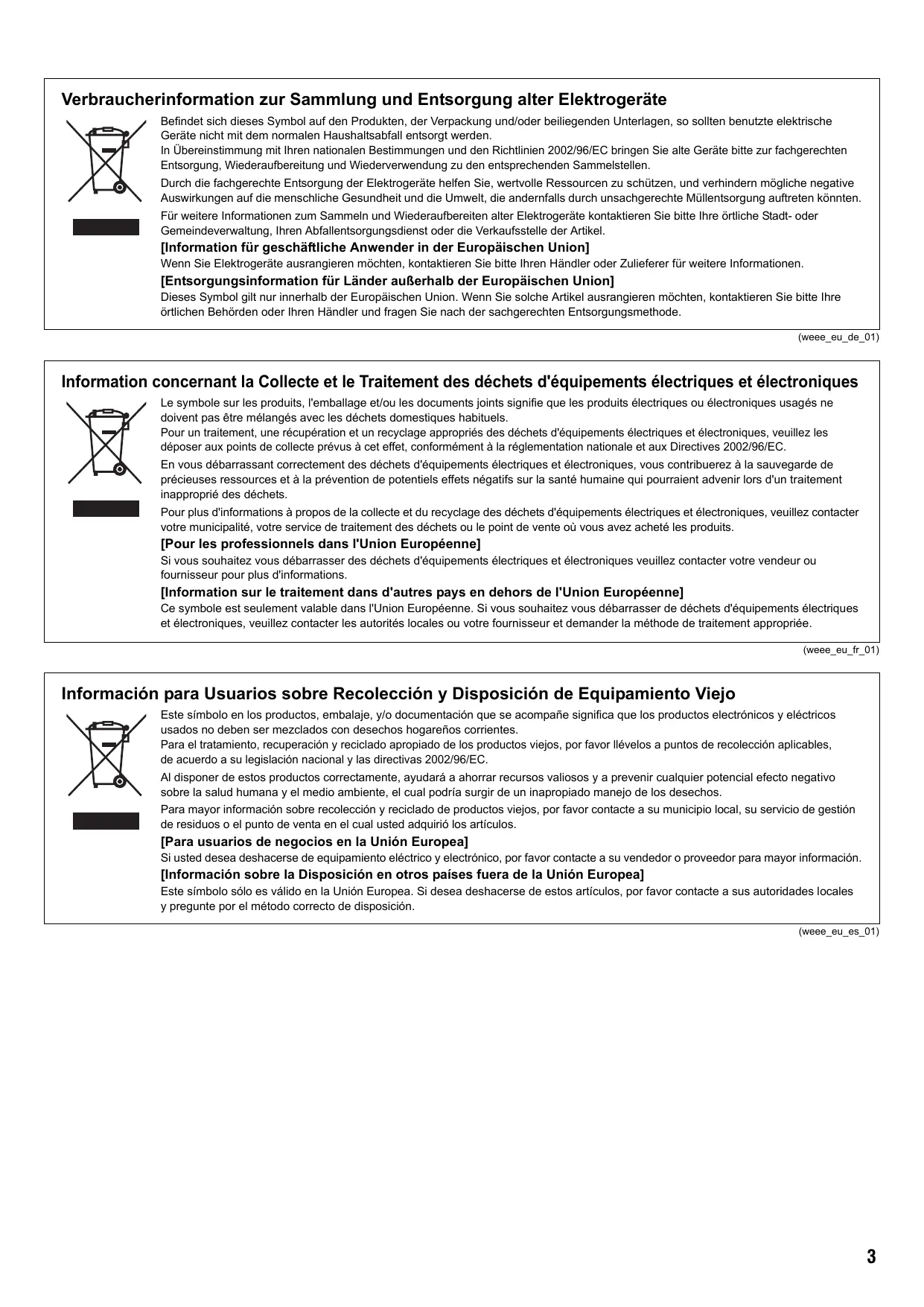 OBSERVERA! Verbraucherinformation zur Sammlung und Entsorgung alter Elektrogeräte Befindet sich dieses Symbol auf den Produkten, der Verpackung und/oder beiliegenden Unterlagen, so sollten benutzte elektrische Geräte nicht mit dem normalen Haushaltsabfall entsorgt werden. In Übereinstimmung mit Ihren nationalen Bestimmungen und den Richtlinien 2002/96/EC bringen Sie alte Geräte bitte zur fachgerechten Entsorgung, Wiederaufbereitung und Wiederverwendung zu den entsprechenden Sammelstellen. Durch die fachgerechte Entsorgung der Elektrogeräte helfen Sie, wertvolle Ressourcen zu schützen, und verhindern mögliche negative Auswirkungen auf die menschliche Gesundheit und die Umwelt, die andernfalls durch unsachgerechte Müllentsorgung auftreten könnten. Für weitere Informationen zum Sammeln und Wiederaufbereiten alter Elektrogeräte kontaktieren Sie bitte Ihre örtliche Stadt- oder Gemeindeverwaltung, Ihren Abfallentsorgungsdienst oder die Verkaufsstelle der Artikel. [Information für geschäftliche Anwender in der Europäischen Union] Wenn Sie Elektrogeräte ausrangieren möchten, kontaktieren Sie bitte Ihren Händler oder Zulieferer für weitere Informationen. [Entsorgungsinformation für Länder außerhalb der Europäischen Union] Dieses Symbol gilt nur innerhalb der Europäischen Union. Wenn Sie solche Artikel ausrangieren möchten, kontaktieren Sie bitte Ihre örtlichen Behörden oder Ihren Händler und fragen Sie nach der sachgerechten Entsorgungsmethode. (weee_eu_de_01) Information concernant la Collecte et le Traitement des déchets d'équipements électriques et électroniques Le symbole sur les produits, l'emballage et/ou les documents joints signifie que les produits électriques ou électroniques usagés ne doivent pas être mélangés avec les déchets domestiques habituels. Pour un traitement, une récupération et un recyclage appropriés des déchets d'équipements électriques et électroniques, veuillez les déposer aux points de collecte prévus à cet effet, conformément à la réglementation nationale et aux Directives 2002/96/EC. En vous débarrassant correctement des déchets d'équipements électriques et électroniques, vous contribuerez à la sauvegarde de précieuses ressources et à la prévention de potentiels effets négatifs sur la santé humaine qui pourraient advenir lors d'un traitement inapproprié des déchets. Pour plus d'informations à propos de la collecte et du recyclage des déchets d'équipements électriques et électroniques, veuillez contacter votre municipalité, votre service de traitement des déchets ou le point de vente où vous avez acheté les produits. [Pour les professionnels dans l'Union Européenne] Si vous souhaitez vous débarrasser des déchets d'équipements électriques et électroniques veuillez contacter votre vendeur ou fournisseur pour plus d'informations. [Information sur le traitement dans d'autres pays en dehors de l'Union Européenne] Ce symbole est seulement valable dans l'Union Européenne. Si vous souhaitez vous débarrasser de déchets d'équipements électriques et électroniques, veuillez contacter les autorités locales ou votre fournisseur et demander la méthode de traitement appropriée. (weee_eu_fr_01) Información para Usuarios sobre Recolección y Disposición de Equipamiento Viejo Este símbolo en los productos, embalaje, y/o documentación que se acompañe significa que los productos electrónicos y eléctricos usados no deben ser mezclados con desechos hogareños corrientes. Para el tratamiento, recuperación y reciclado apropiado de los productos viejos, por favor llévelos a puntos de recolección aplicables, de acuerdo a su legislación nacional y las directivas 2002/96/EC. Al disponer de estos productos correctamente, ayudará a ahorrar recursos valiosos y a prevenir cualquier potencial efecto negativo sobre la salud humana y el medio ambiente, el cual podría surgir de un inapropiado manejo de los desechos. Para mayor información sobre recolección y reciclado de productos viejos, por favor contacte a su municipio local, su servicio de gestión de residuos o el punto de venta en el cual usted adquirió los artículos. [Para usuarios de negocios en la Unión Europea] Si usted desea deshacerse de equipamiento eléctrico y electrónico, por favor contacte a su vendedor o proveedor para mayor información. [Información sobre la Disposición en otros países fuera de la Unión Europea] Este símbolo sólo es válido en la Unión Europea. Si desea deshacerse de estos artículos, por favor contacte a sus autoridades locales y pregunte por el método correcto de disposición. (weee_eu_es_01)