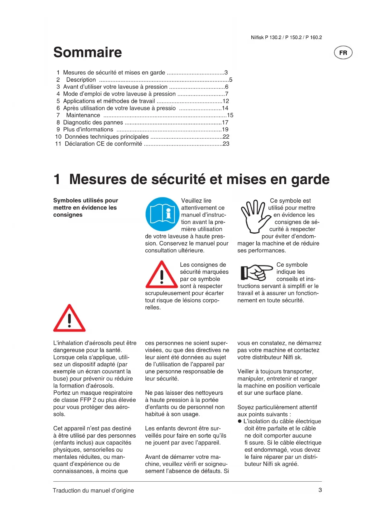 - Traduction du manuel d’origine Sommaire 1 Mesures de sécurité et mises en garde p. 3