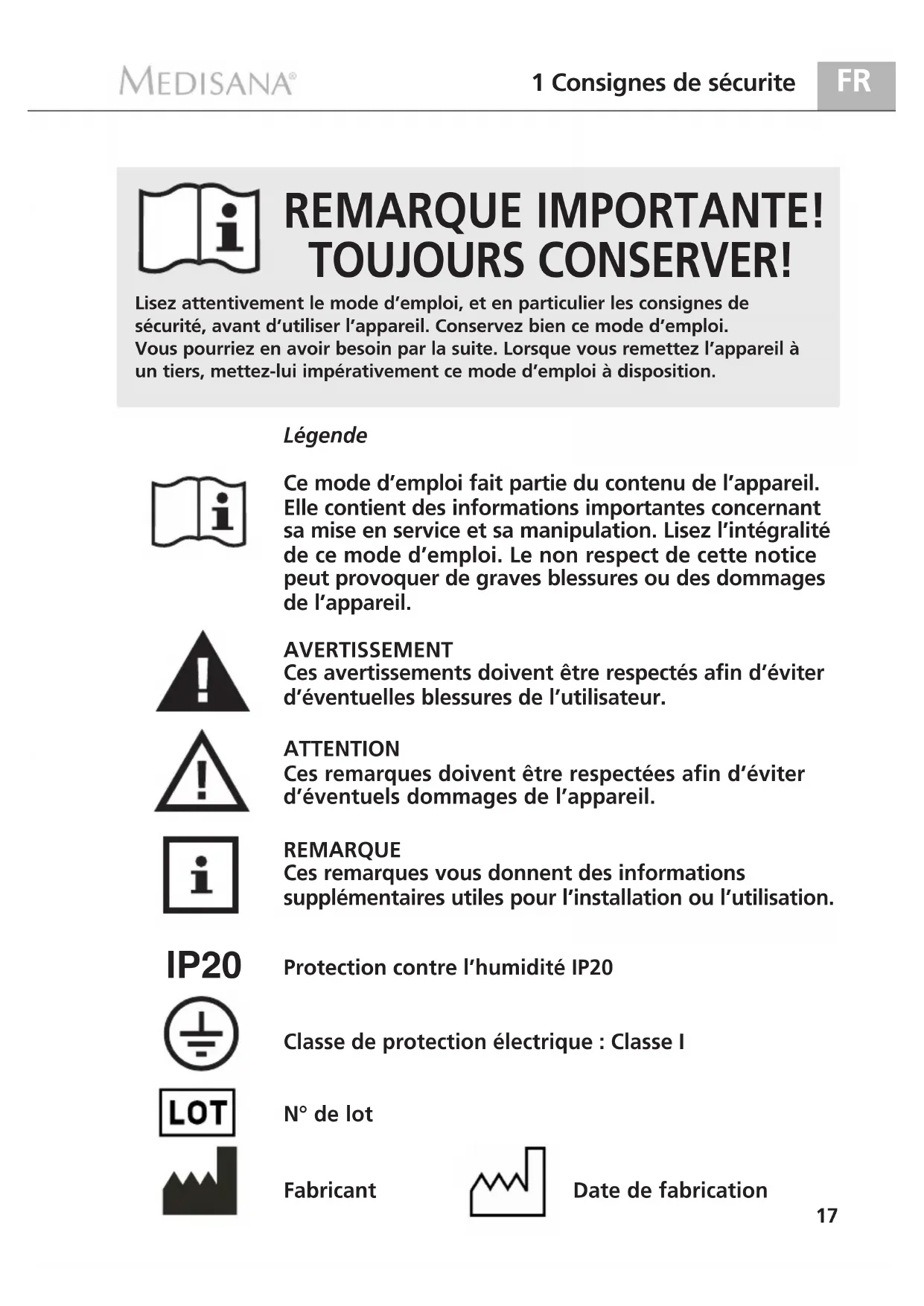 1 Consignes de sécurite REMARQUE IMPORTANTE! TOUJOURS CONSERVER! LégendeCe mode d’emploi fait partie du contenu de l’appareil.Elle contient des informations importantes concernantsa mise en service et sa manipulation. Lisez l’intégralitéde ce mode d’emploi. Le non respect de cette noticepeut provoquer de graves blessures ou des dommagesde l’appareil.AVERTISSEMENTCes avertissements doivent être respectés afin d’éviterd’éventuelles blessures de l’utilisateur.ATTENTIONCes remarques doivent être respectées afin d’éviterd’éventuels dommages de l’appareil.REMARQUECes remarques vous donnent des informationssupplémentaires utiles pour l’installation ou l’utilisation.Protection contre l’humidité IP20Classe de protection électrique : Classe IN° de lotFabricant Date de fabrication
