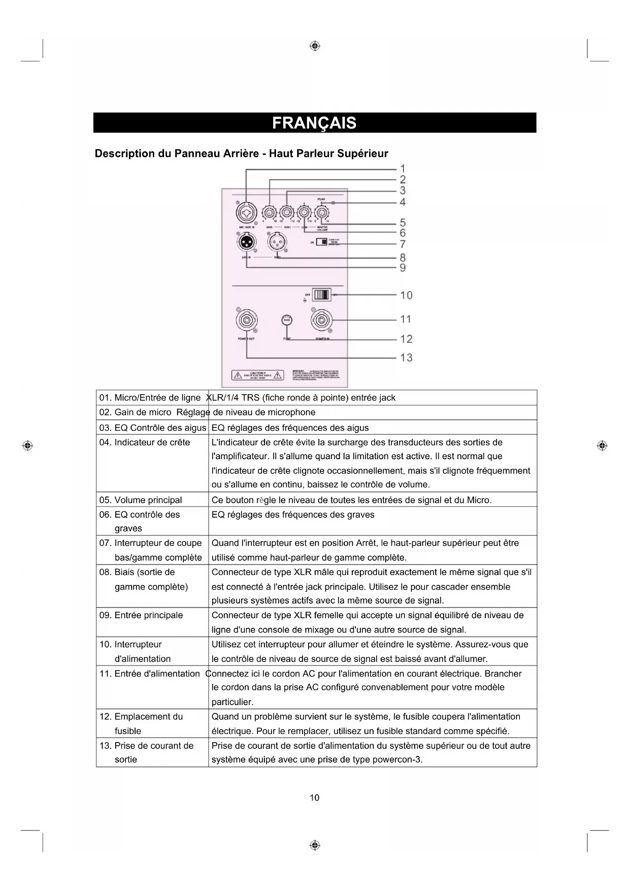 09. Entrée principale Connecteur de type XLR femelle qui accepte un signal équilibré de niveau de
