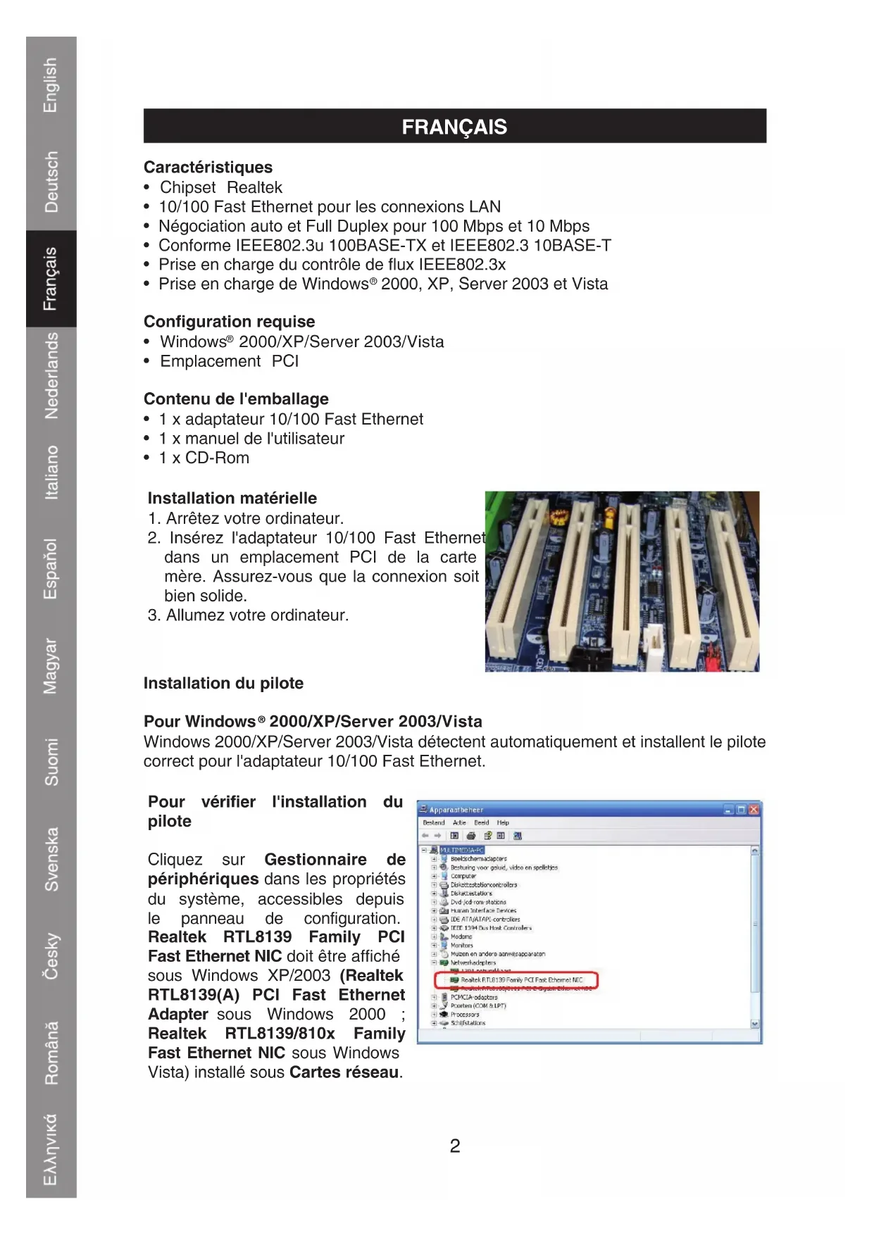 2000/XP/Server 2003/Vista Windows 2000/XP/Server 2003/Vista détectent automatiquement et installent le pilote correct pour l'adaptateur 10/100 Fast Ethernet. Pour vérifier l'installation du pilote Cliquez sur Gestionnaire de périphériques dans les propriétés du système, accessibles depuis le panneau de configuration. Realtek RTL8139 Family PCI Fast Ethernet NIC doit être affiché sous Windows XP/2003 (Realtek RTL8139(A) PCI Fast Ethernet Adapter sous Windows 2000 ; Realtek RTL8139/810x Family Fast Ethernet NIC sous Windows Vista) installé sous Cartes réseau.3 Déclaration de conformité Nous, Nedis B.V. De Tweeling 28 5215MC ’s-Hertogenbosch Pays-Bas Tél. : 0031 73 599 1055 E-mail : info@nedis.com Déclarons que le produit : Marque : König Electronic Modèle : CMP-NWCARD12 Désignation : Carte PCI LAN 10/100 Mbit est conforme aux normes suivantes :