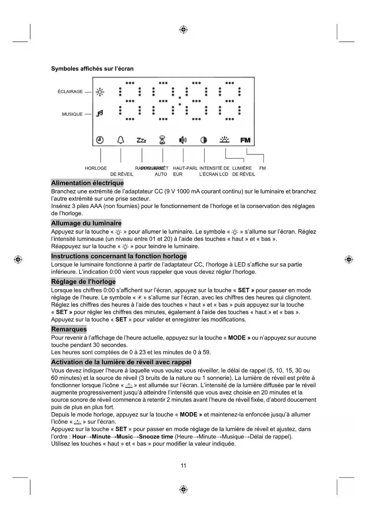 Alimentation électrique Branchez une extrémité de l’adaptateur CC (9 V 1000 mA courant continu) sur le luminaire et branchez l’autre extrémité sur une prise secteur. Insérez 3 piles AAA (non fournies) pour le fonctionnement de l’horloge et la conservation des réglages de l’horloge. Allumage du luminaire Appuyez sur la touche « » pour allumer le luminaire. Le symbole « » s’allume sur l’écran. Réglez l’intensité lumineuse (un niveau entre 01 et 20) à l’aide des touches « haut » et « bas ». Réappuyez sur la touche « » pour teindre le luminaire. Instructions concernant la fonction horloge Lorsque le luminaire fonctionne à partir de l’adaptateur CC, l’horloge à LED s’affiche sur sa partie inférieure. L’indication 0:00 vient vous rappeler que vous devez régler l’horloge. Réglage de l’horloge Lorsque les chiffres 0:00 s’affichent sur l’écran, appuyez sur la touche « SET » pour passer en mode réglage de l’heure. Le symbole « » s’allume sur l’écran, avec les chiffres des heures qui clignotent. Réglez les chiffres des heures à l’aide des touches « haut » et « bas » puis appuyez sur la touche « SET » pour régler les chiffres des minutes, également à l’aide des touches « haut » et « bas ». Appuyez sur la touche « SET » pour valider et enregistrer les modifications. Remarques Pour revenir à l’affichage de l’heure actuelle, appuyez sur la touche « MODE » ou n’appuyez sur aucune touche pendant 30 secondes. Les heures sont comptées de 0 à 23 et les minutes de 0 à 59. Activation de la lumière de réveil avec rappel Vous devez indiquer l’heure à laquelle vous voulez vous réveiller, le délai de rappel (5, 10, 15, 30 ou 60 minutes) et la source de réveil (3 bruits de la nature ou 1 sonnerie). La lumière de réveil est prête à fonctionner lorsque l’icône « » est allumée sur l’écran. L’intensité de la lumière diffusée par le réveil augmente progressivement jusqu’à atteindre l’intensité que vous avez choisie en 20 minutes et la source sonore de réveil commence à retentir 2 minutes avant l’heure de réveil fixée, d’abord doucement puis de plus en plus fort. Depuis le mode horloge, appuyez sur la touche « MODE » et maintenez-la enfoncée jusqu’à allumer l’icône « » sur l’écran. Appuyez sur la touche « SET » pour passer en mode réglage de la lumière de réveil et ajustez, dans l’ordre : Hour→Minute→Music→Snooze time (Heure→Minute→Musique→Délai de rappel). Utilisez les touches « haut » et « bas » pour modifier la valeur indiquée.12 Choisissez ainsi l’heure entre 0 et 23, les minutes entre 0 et 59, et la sonnerie entre 3 bruits de la nature et 1 sirène. Désactivation de la fonction lumière de réveil Lorsque la sonnerie retentit, appuyez sur l’une quelconque des touches pour l’arrêter et activer la fonction de rappel. La lumière reste allumée (ON). Lorsque la sonnerie de rappel retentit, appuyez sur l’une des touches du luminaire pour l’arrêter. Vous pouvez activer 3 fois la fonction rappel. Depuis le mode lumière de réveil, appuyez sur la touche « » et maintenez-la enfoncée pendant 2 secondes pour activer ou désactiver la fonction lumière de réveil. Depuis le mode horloge, appuyez sur la touche « Set » et maintenez-la enfoncée pendant 2 secondes pour activer ou désactiver le délai de rappel. Remarques Pour revenir à l’affichage de l’heure actuelle, appuyez sur la touche « MODE » ou n’appuyez sur aucune touche pendant 30 secondes. L’intensité lumineuse et le niveau sonore de la fonction lumière de réveil sont ceux que vous avez choisis la dernière fois. Réglage de l’heure de la sonnerie Depuis le mode horloge, appuyez sur la touche « MODE » et maintenez-la enfoncée jusqu’à allumer l’icône « »sur l’écran. Appuyez sur la touche « SET » pour passer en mode réglage de la sonnerie et ajustez, dans l’ordre : Hour→Minute→Music (Heure→Minute→Musique). Utilisez les touches « haut » et « bas » pour modifier la valeur indiquée. Choisissez ainsi l’heure entre 0 et 23, les minutes entre 0 et 59, et la sonnerie entre 3 bruits de la nature et 1 sirène. Désactivation de la sonnerie de réveil Lorsque la sonnerie retentit, appuyez sur l’une quelconque des touches pour l’arrêter et activer la fonction de rappel. La sonnerie de réveil retentit pendant 1 minute et la fonction rappel peut être activée au plus 3 fois. Depuis le mode sonnerie de réveil, appuyez sur la touche « » et maintenez-la enfoncée pendant 2 secondes pour activer ou désactiver la sonnerie de réveil. Depuis le mode rappel, appuyez sur la touche « Set » et maintenez-la enfoncée pendant 2 secondes pour activer ou désactiver le délai de rappel. Remarques Pour revenir à l’affichage de l’heure actuelle, appuyez sur la touche « MODE » ou n’appuyez sur aucune touche pendant 30 secondes. La sonnerie ne retentit pas lorsque l’heure de son déclenchement se trouve dans la période de réveil par la lumière. Réglage du délai avant l’arrêt automatique Pour utiliser la fonction arrêt automatique, sélectionnez un délai (5, 15, 30 ou 60 minutes) et une sonnerie (3 bruits de la nature ou 1 sirène). La fonction arrêt automatique est prête à fonctionner lorsque l’icône « » est allumée sur l’écran. Le niveau de l’intensité de l’éclairage et du volume sonore décroît progressivement jusqu’à s’éteindre complètement à la fin du délai que vous avez choisi. Depuis le mode horloge, appuyez sur la touche « MODE » et maintenez-la enfoncée jusqu’à allumer l’icône « » sur l’écran. Appuyez sur la touche « SET » pour accéder aux délais possibles, selon la séquence : 00:05→00:15→00:30→00:45→1:00→Music (Musique). Utilisez les touches « haut » et « bas » pour modifier la valeur indiquée. Vous avez le choix entre 3 bruits de la nature et 1 si