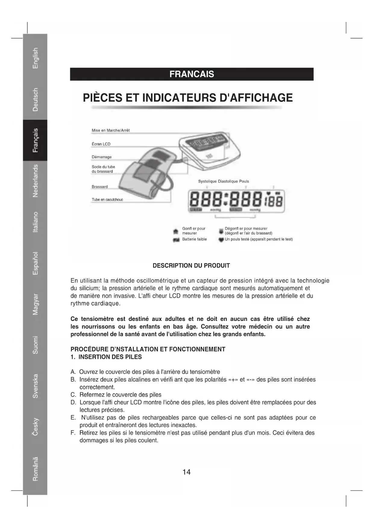 A. Ouvrez le couvercle des piles à l'arrière du tensiomètre B. Insérez deux piles alcalines en vérifi ant que les polarités «+» et «-» des piles sont insérées correctement. C. Refermez le couvercle des piles D. Lorsque l'affi cheur LCD montre l'icône des piles, les piles doivent être remplacées pour des lectures précises. E. N'utilisez pas de piles rechargeables parce que celles-ci ne sont pas adaptées pour ce produit et entraîneront des lectures inexactes. F. Retirez les piles si le tensiomètre n'est pas utilisé pendant plus d'un mois. Ceci évitera des dommages si les piles coulent.15