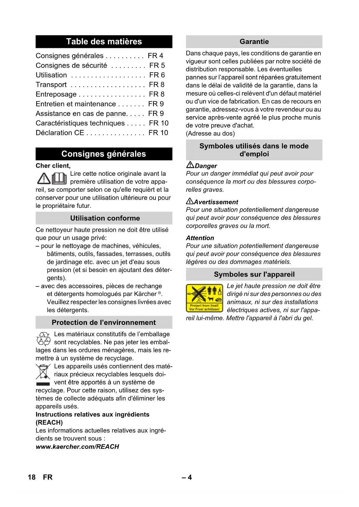 Veuillez respecter les consignes livrées avec les détergents. Les matériaux constitutifs de l’emballage sont recyclables. Ne pas jeter les embal- lages dans les ordures ménagères, mais les re- mettre à un système de recyclage. Les appareils usés contiennent des maté- riaux précieux recyclables lesquels doi- vent être apportés à un système de recyclage. Pour cette raison, utilisez des sys- tèmes de collecte adéquats afin d'éliminer les appareils usés. Instructions relatives aux ingrédients (REACH) Les informations actuelles relatives aux ingré- dients se trouvent sous : www.kaercher.com/REACH Dans chaque pays, les conditions de garantie en vigueur sont celles publiées par notre société de distribution responsable. Les éventuelles pannes sur l’appareil sont réparées gratuitement dans le délai de validité de la garantie, dans la mesure où celles-ci relèvent d'un défaut matériel ou d'un vice de fabrication. En cas de recours en garantie, adressez-vous à votre revendeur ou au service après-vente agréé le plus proche munis de votre preuve d'achat. (Adresse au dos) Danger Pour un danger immédiat qui peut avoir pour conséquence la mort ou des blessures corpo- relles graves. 몇 Avertissement Pour une situation potentiellement dangereuse qui peut avoir pour conséquence des blessures corporelles graves ou la mort. Attention Pour une situation potentiellement dangereuse qui peut avoir pour conséquence des blessures légères ou des dommages matériels. Le jet haute pression ne doit être dirigé ni sur des personnes ou des animaux, ni sur des installations électriques actives, ni sur l'appa- reil lui-même. Mettre l'appareil à l'abri du gel. Table des matières Consignes générales ... FR 4 Consignes de sécurité ... FR 5 Utilisation ... FR 6 Transport ... FR 8 Entreposage ... FR 8 Entretien et maintenance ... FR 9 Assistance en cas de panne... FR 9 Caractéristiques techniques ... FR 10 Déclaration CE ... FR 10 Consignes générales Utilisation conforme Protection de l’environnement Garantie Symboles utilisés dans le mode d'emploi Symboles sur l'appareil 18 FR– 5 Danger Ne jamais saisir la fiche secteur ni la prise de courant avec des mains humides. Ne jamais mettre l’appareil en service si le câble d’alimentation ou des pièces impor- tantes de l’appareil, telles que par exemple le flexible haute pression, le poignée-pistolet ou les dispositifs de sécurité sont endommagés. Vérifier avant chaque utilisation que le câble d'alimentation et la fiche secteur ne sont pas endommagés. Un câble d’alimentation en- dommagé doit immédiatement être rempla- cé par le service après-vente ou un électricien agréé. Vérifier avant chaque utilisation que le flexible haute-pression n'est pas endomma- gé. Un flexible haute pression endommagé doit immédiatement être remplacé. Il est interdit d’utiliser l’appareil dans des zones présentant des risques d’explosion. Si l’appareil est utilisé dans des zones de danger (par exemple des stations essence), il faut tenir compte des consignes de sécuri- té correspondantes. Une utilisation incorrecte des jets haute pression peut présenter des dangers. Le jet ne doit pas être dirigé sur des personnes, animaux, installations électriques actives ni sur l'appareil lui-même. Ne jamais diriger le jet haute pression sur soi- même ni sur d’autres personnes dans le but de nettoyer les vêtements ou les chaussures. Ne jamais laver au jet des objets contenant des substances nocives (par exemple de l’amiante). Le jet haute pression risque d’endommager les pneus/valves de véhicules et les pneus risquent d’éclater. Le premier indice d’endommagement est une décoloration du pneu. Des pneus/valves de véhicules endommagés présentent des dan- gers de mort. Il faut toujours se tenir au moins à 30 cm des pièces pour les laver au jet ! Risque d'explosion ! Ne pas pulvériser de liquides inflammables. Ne jamais aspirer des liquides contenant des sol- vants ni des acides ou des solvants non dilués, tels que par exemple de l’essence, du diluant pour peinture ou du fuel ! Le nuage de pulvérisa- tion est extrêmement inflammable, explosif et toxique. Ne pas utiliser d’acétone, d’acides ni de solvants non dilués, du fait de leur effet corrosif sur les matériaux constituant l’appareil. 몇 Avertissement La fiche secteur et la fiche d'une rallonge doivent être étanches et ne doivent pas re- poser dans l'eau. Des rallonges non adaptées peuvent pré- senter des risques. Utiliser à l’air libre uni- quement des câbles de rallonge autorisées et marquées de façon adéquate avec une section suffisante du conducteur.