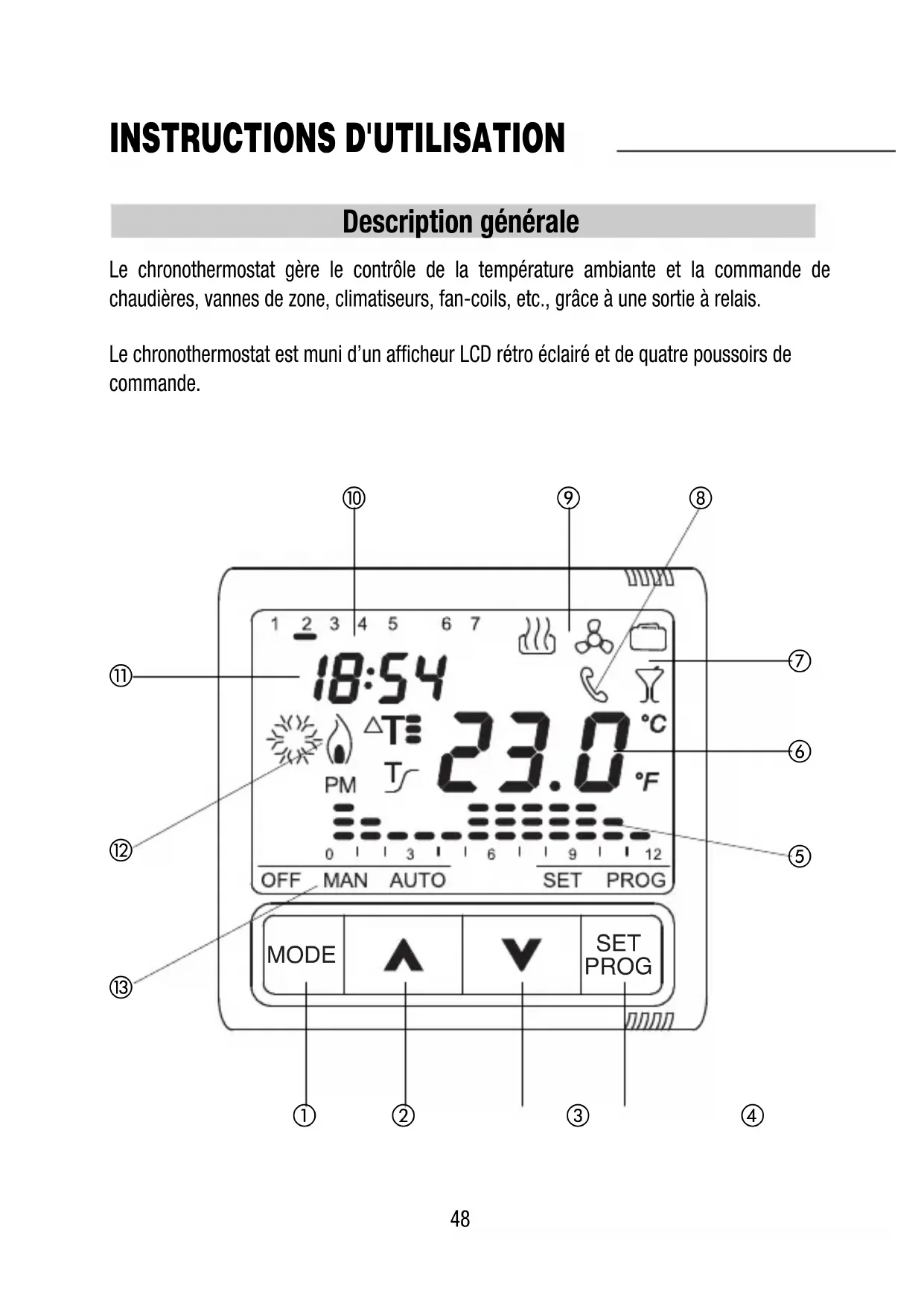 ① MODE : sélection de la modalité (2) Increment / Sélection des paramètres ③ Décrément / Sélection des paramètres (4) SET/PROG : Définition des programmes / Programmation
