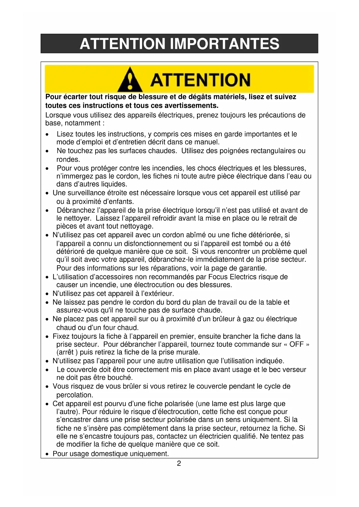 - L'utilisation d'accessoires non recommandés par Focus Electrics risque de causer un incendie, une électrocution ou des blessures.