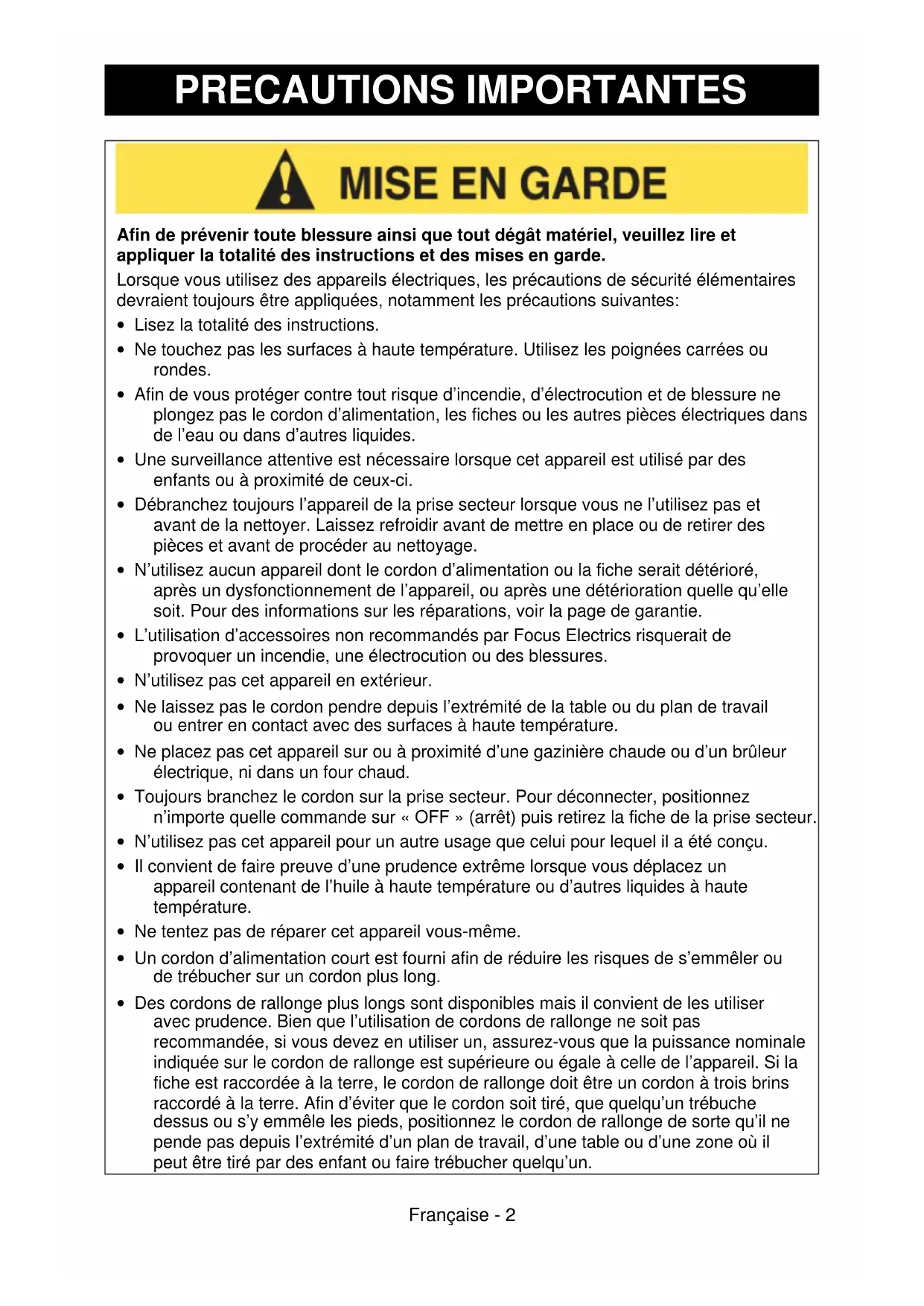 N'tutilisez pas cet appeareil pour un autre usage que celui pour lequel il a ete concu. - Il convient de faire preuve d'une prudence extrème lorsque vous déplacez un apparéil contenant de l'huile à haute température ou d'autres liquides à haute température.