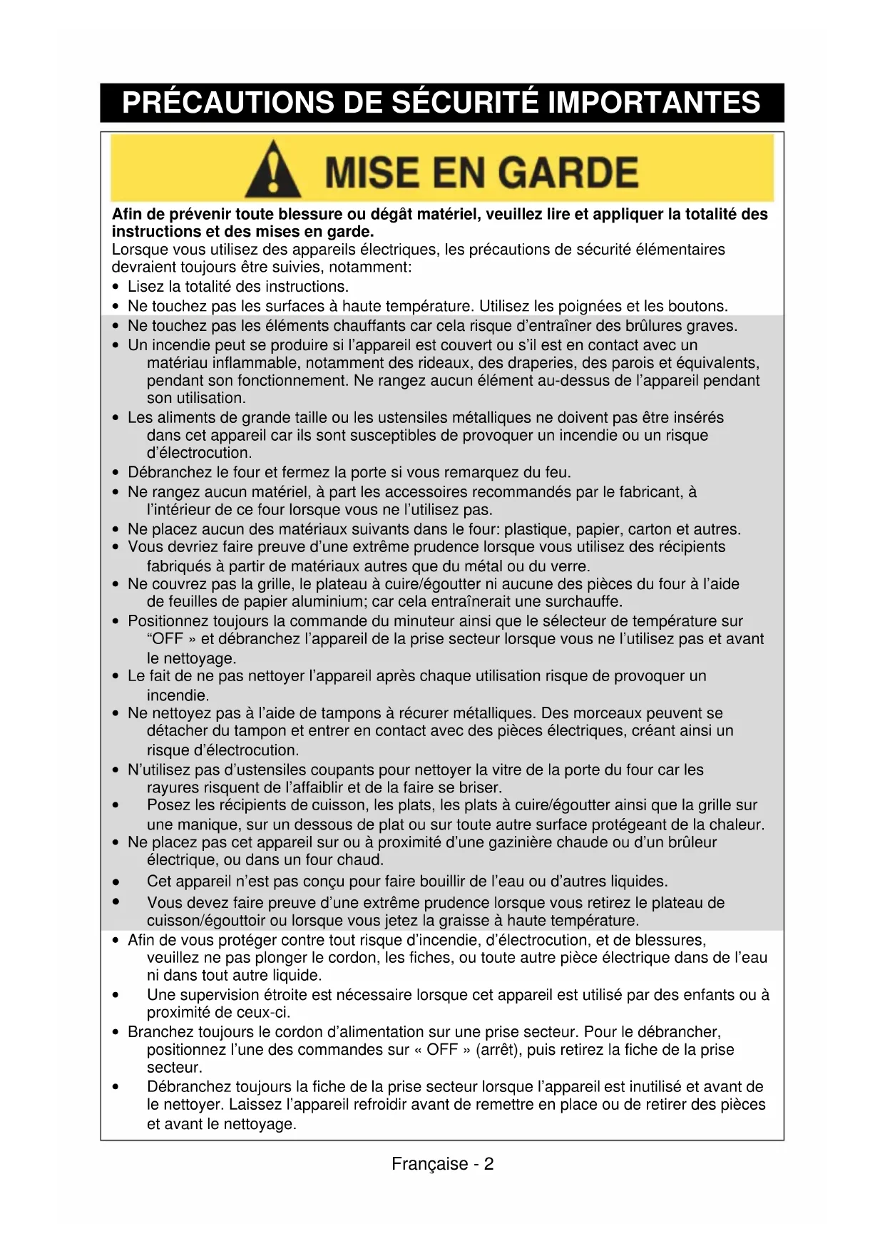 Une fois le temps écoulé, une sonnerie retentit et le four s’éteint alors automatiquement. Le chauffage peut également être désactivé manuellement en positionnant la commande de fonction sur « OFF » (arrêt). En utilisant des maniques ou des gants de cuisine, ouvrez la porte et sortez le récipient contenant les aliments. Si vous le souhaitez, pour un accès plus facile, utilisez l’ustensile d’extraction de la grille pour faire glisser la grille hors du four. Débranchez le four de la prise secteur. Laissez le four refroidir complètement avant de le nettoyer. ATTENTION: Faites preuve d’une extrême prudence lorsque vous ouvrez la porte. Maintenez les mains et le visage à l’écart car de l’air très chaud ou de la vapeur peuvent s’échapper au moment de l’ouverture de la porte. Ne placez rien sur la porte vitrée, car cela risque de la détériorer. REMARQUE: Suivez les instructions fournies sur l’emballage ou les instructions de la recette pour les temps de cuisson et les températures lorsque vous cuisez des pizzas, des amuse- bouches, des cookies, des gâteaux, etc. votre four à poser sur un plan de travail étant plus petit qu’un four traditionnel, il peut atteindre des températures élevées plus rapidement et cuire dans un laps de temps moins long. Assurez-vous de bien surveiller les aliments afin de ne pas les brûler. De plus, si vous préparez plusieurs cuissons à la suite, il est possible que vous deviez réduire les temps de cuisson pour les fournées suivantes après la première cuisson. Pour un nettoyage facile, positionnez le plateau à cuire/égoutter dans le guide de support de la grille inférieure afin de recueillir tout écoulement.Française - 5 Fonction Four/Four à Convection: (éléments de chauffage supérieur & inférieur) ATTENTION: N’utilisez pas de sachets à rôtir, de récipients en plastique ou en verre dans le four car cela risque d’entraîner des détériorations.