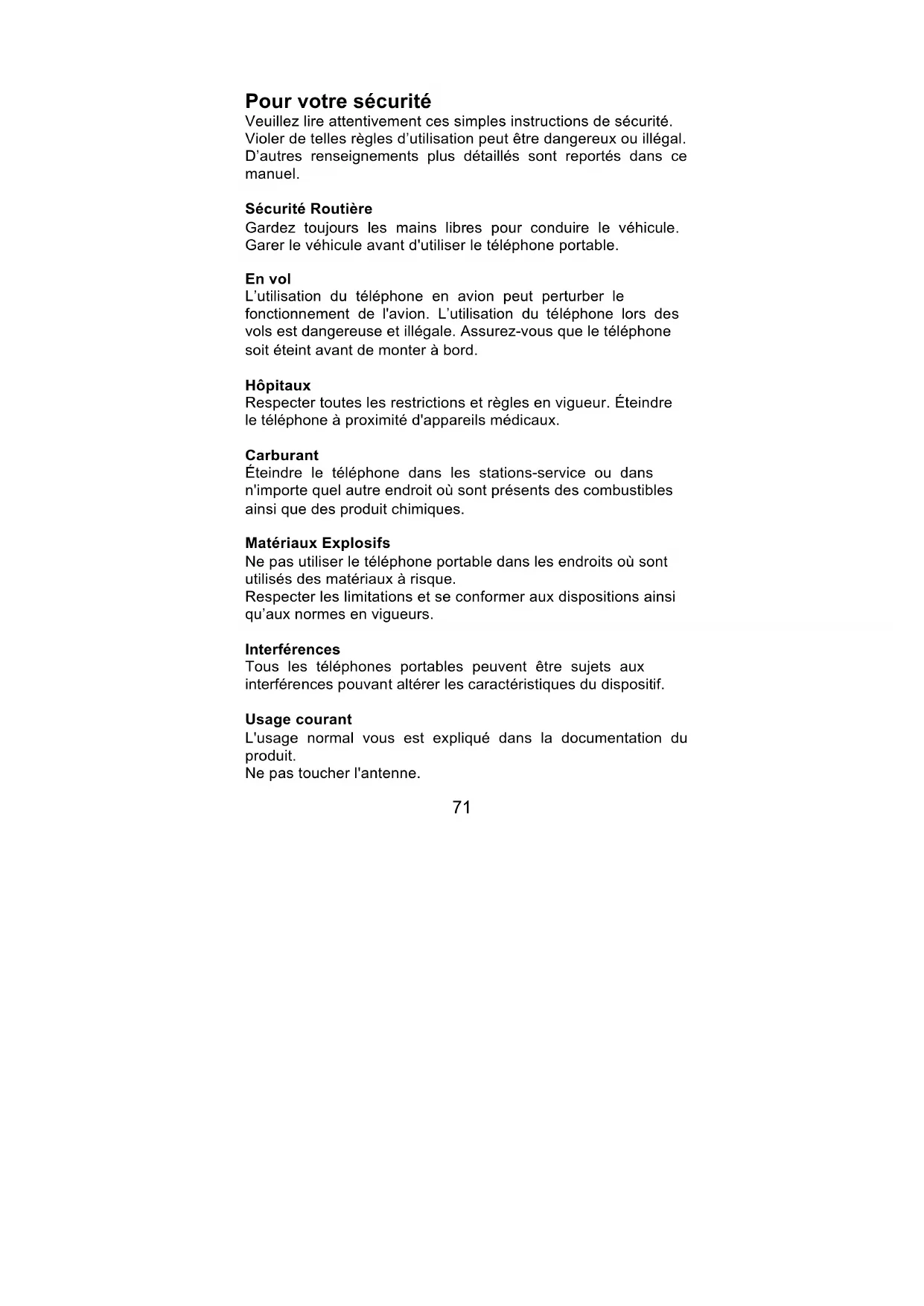 Entretien ................................................................................... 92 Entretien de votre téléphone .................................................... 93 Consignes de sécurité ............................................................. 9371 Pour votre sécurité Veuillez lire attentivement ces simples instructions de sécurité. Violer de telles règles d’utilisation peut être dangereux ou illégal. D’autres renseignements plus détaillés sont reportés dans ce manuel. Sécurité Routière Gardez toujours les mains libres pour conduire le véhicule. Garer le véhicule avant d'utiliser le téléphone portable. En vol L’utilisation du téléphone en avion peut perturber le fonctionnement de l'avion. L’utilisation du téléphone lors des vols est dangereuse et illégale. Assurez-vous que le téléphone soit éteint avant de monter à bord. Hôpitaux Respecter toutes les restrictions et règles en vigueur. Éteindre le téléphone à proximité d'appareils médicaux. Carburant Éteindre le téléphone dans les stations-service ou dans n'importe quel autre endroit où sont présents des combustibles ainsi que des produit chimiques. Matériaux Explosifs Ne pas utiliser le téléphone portable dans les endroits où sont utilisés des matériaux à risque. Respecter les limitations et se conformer aux dispositions ainsi qu’aux normes en vigueurs. Interférences Tous les téléphones portables peuvent être sujets aux interférences pouvant altérer les caractéristiques du dispositif. Usage courant L'usage normal vous est expliqué dans la documentation du produit. Ne pas toucher l'antenne.72 Accessoires et batterie Veillez à toujours utiliser les batteries et les accessoires approuvés par le fabriquant. Ne jamais brancher d’accessoires ou de produits non compatibles. Appel d’urgence Assurez-vous que le téléphone soit allumé et en service. Insérer le numéro d'urgence, et pressez ensuite sur la touche d'appel. Votre position sera communiquée. Veuillez atteindre l’autorisation avant de mettre fin à l'appel. Votre téléphone