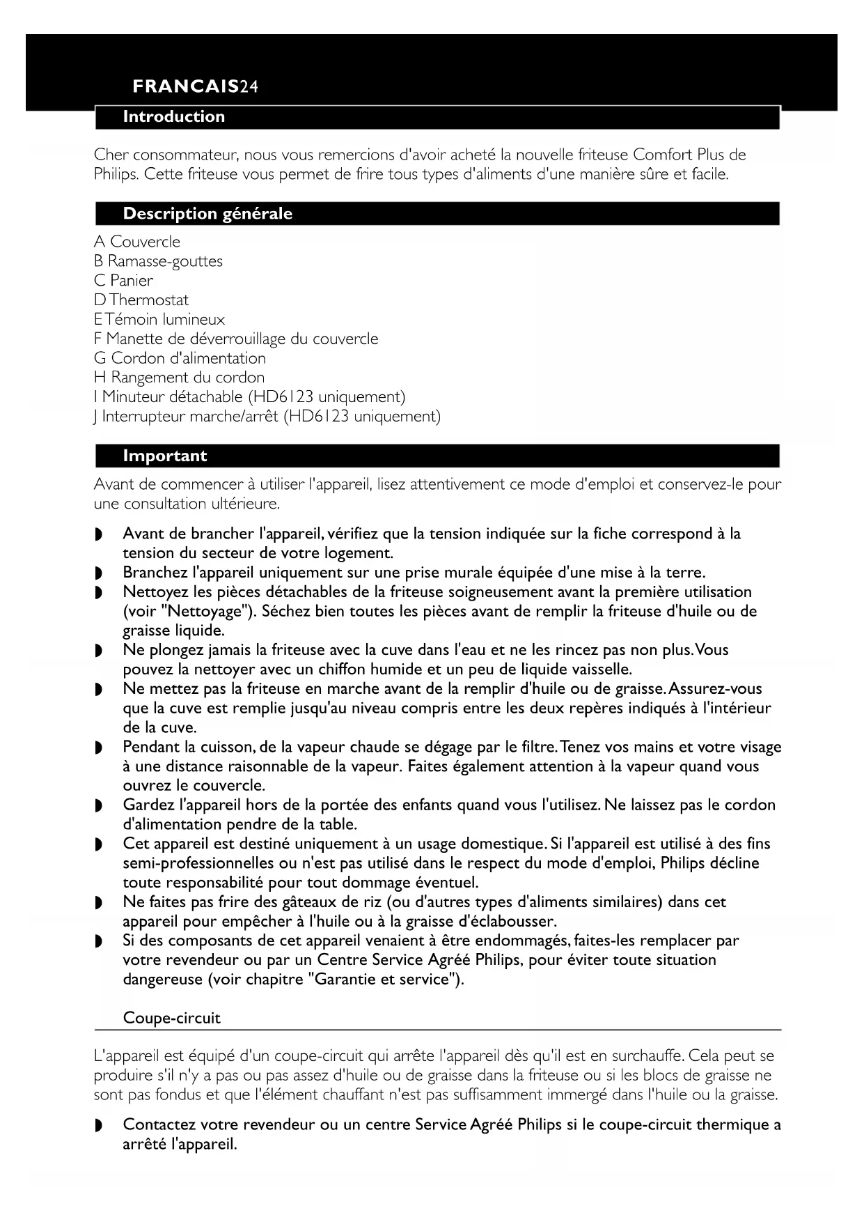 3 bis 4 3 bis 4 4 bis 5 5 bis 6 2 bis 3 3 bis 4 Empfohlene Menge pro Zubereitungsport ion 600 g 450 g 3 bis 5 Stück 5 Stück 4 Stück 8 bis 10 Stück 2 bis 3 Stück 5 bis 6 Stück 8 bis 10 Stück 8 bis 10 Stück 8 bis 10 Stück 12 bis 15 Stück 8 bis 10 Stück 5 Stück 600 g 450 g 600 g 600 g 4 bis 5 Stück 3 bis 4 Stück 2 bis 4 Stück 2 Stück Art der Speise Hausgemachte Pommes frites*), 1. Frittiergang Frischfisch Hähnchen (Schenkel) Käsekroketten Mini-Kartoffelpuffer Frittiertes Gemüse (Pilze, Blumenkohl) Chinesische Frühlingsrollen Vietnamesische Frühlingsrollen Hähnchen-Nuggets Mini-Snacks Fleischbällchen (klein) Muscheln Garnelen Apfel-Beignets Selbstgemachte Pommes frites *) 2. Frittiergang Tiefgefrorene Pommes frites Kartofffelchips Auberginen in Scheiben Kartoffelkroketten Krapfen Camembert (paniert) Wiener Schnitzel Temperatur 160c C 170c C 180c C 190c CIntroduction Cher consommateur, nous vous remercions d'avoir acheté la nouvelle friteuse Comfort Plus de Philips. Cette friteuse vous permet de frire tous types d'aliments d'une manière sûre et facile. Description générale A Couvercle B Ramasse-gouttes C Panier D Thermostat E Témoin lumineux F Manette de déverrouillage du couvercle G Cordon d'alimentation H Rangement du cordon I Minuteur détachable (HD6123 uniquement) J Interrupteur marche/arrêt (HD6123 uniquement) Important Avant de commencer à utiliser l'appareil, lisez attentivement ce mode d'emploi et conservez-le pour une consultation ultérieure. ◗ Avant de brancher l'appareil, vérifiez que la tension indiquée sur la fiche correspond à la tension du secteur de votre logement. ◗ Branchez l'appareil uniquement sur une prise murale équipée d'une mise à la terre. ◗ Nettoyez les pièces détachables de la friteuse soigneusement avant la première utilisation (voir "Nettoyage"). Séchez bien toutes les pièces avant de remplir la friteuse d'huile ou de graisse liquide. ◗ Ne plongez jamais la friteuse avec la cuve dans l'eau et ne les rincez pas non plus.Vous pouvez la nettoyer avec un chiffon humide et un peu de liquide vaisselle. ◗ Ne mettez pas la friteuse en marche avant de la remplir d'huile ou de graisse.Assurez-vous que la cuve est remplie jusqu'au niveau compris entre les deux repères indiqués à l'intérieur de la cuve. ◗ Pendant la cuisson, de la vapeur chaude se dégage par le filtre.Tenez vos mains et votre visage à une distance raisonnable de la vapeur. Faites également attention à la vapeur quand vous ouvrez le couvercle. ◗ Gardez l'appareil hors de la portée des enfants quand vous l'utilisez. Ne laissez pas le cordon d'alimentation pendre de la table. ◗ Cet appareil est destiné uniquement à un usage domestique. Si l'appareil est utilisé à des fins semi-professionnelles ou n'est pas utilisé dans le respect du mode d'emploi, Philips décline toute responsabilité pour tout dommage éventuel. ◗ Ne faites pas frire des gâteaux de riz (ou d'autres types d'aliments similaires) dans cet appareil pour empêcher à l'huile ou à la graisse d'éclabousser. ◗ Si des composants de cet appareil venaient à être endommagés, faites-les remplacer par votre revendeur ou par un Centre Service Agréé Philips, pour éviter toute situation dangereuse (voir chapitre "Garantie et service"). Coupe-circuit L'appareil est équipé d'un coupe-circuit qui arrête l'appareil dès qu'il est en surchauffe. Cela peut se produire s'il n'y a pas ou pas assez d'huile ou de graisse dans la friteuse ou si les blocs de graisse ne sont pas fondus et que l'élément chauffant n'est pas suffisamment immergé dans l'huile ou la graisse. ◗ Contactez votre revendeur ou un centre Service Agréé Philips si le coupe-circuit thermique a arrêté l'appareil. FRANCAIS24Préparation à l'emploi Huile et graisse Ne mélangez jamais des types différents d'huile ou de graisse. 1 Si vous voulez utiliser de nouveaux blocs de graisse, faites-les fondre doucement à basse température dans une casserole. 2 Versez avec précaution la graisse fondue dans la friteuse. 3 Rangez la friteuse avec la graisse de nouveau solidifiée à la température de la pièce. Si la graisse est devenue très froide, elle peut éclabousser en fondant. 4 Percez des trous dans la graisse solidifiée avec une fourchette pour éviter les éclaboussures (fig. 1). Utilisation de l'appareil Friture Faites attention: Pendant la cuisson, de la vapeur chaude se dégage par le filtre. 1 Posez l'appareil sur une surface horizontale, plate et stable, hors de portée des enfants. Si vous voulez placer la friteuse sur la cuisinière, assurez-vous que les brûleurs ou les plaques de la cuisinière sont bien éteints. 2 Remplissez la cuve de la friteuse avec de l'huile, de la graisse liquide ou de la graisse préalablement fondue jusqu'au dernier repère (voir "Préparation à l'emploi", section "Huile et graisse" pour instructions sur la modalité d'utilisation de la graisse solide) (fig. 2). 3 Déroulez entièrement le cordon d'alimentation et branchez-le (fig. 3). Assurez-vous que le cordon d'alimentation n'est pas en contact avec les parties chaudes de l'appareil. 4 HD 6123 uniquement - Mettez en marche la friteuse à l'aide de l'interrupteur marche/arrêt (fig. 4). Le témoin lumineux de l'interrupteur marche/arrêt s'allume. 5 Réglez le thermostat sur la température nécessaire (160, 170, 180 ou 190cC) (fig. 5). Lors du chauffage de la friteuse, le témoin lumineux s'allume et s'éteint plusieurs fois. Lorsque le témoin ne s'allume plus, cela signifie que l'huile ou la graisse ont atteint la température choisie. L'huile ou la graisse sera chauffée à la bonne température après environ 10 à 15 minutes. Pour sélectionner la température, reportez-vous aux indications figurant sur l'emballage des aliments à frire ou aux indications figurant dans le tableau de ce mode d'emploi. Une fois que les aliments sont frits, le témoin lumineux se rallume. Attendez qu'il s'éteigne avant de comm