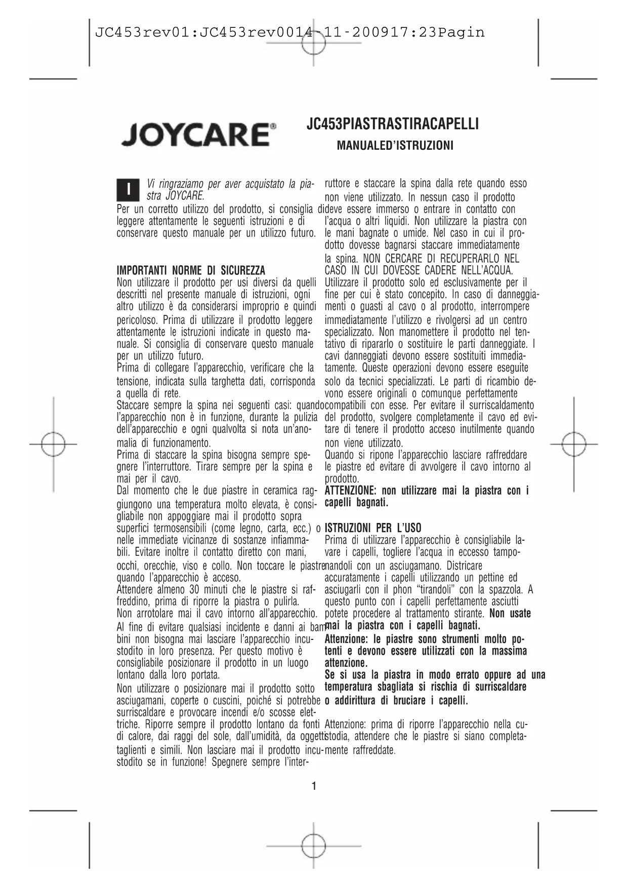 JC 453 rev 01:JC 453 rev 00 14-11-2009 17:23 PaginNous vous remercions pour avoir choisi le fer à lisser JOYCARE. Pour une utilisation correcte de l’appareil, nous vous conseillons de lire attentivement les instructions suivantes et de conserver ce manuel pour les prochaines utilisations.