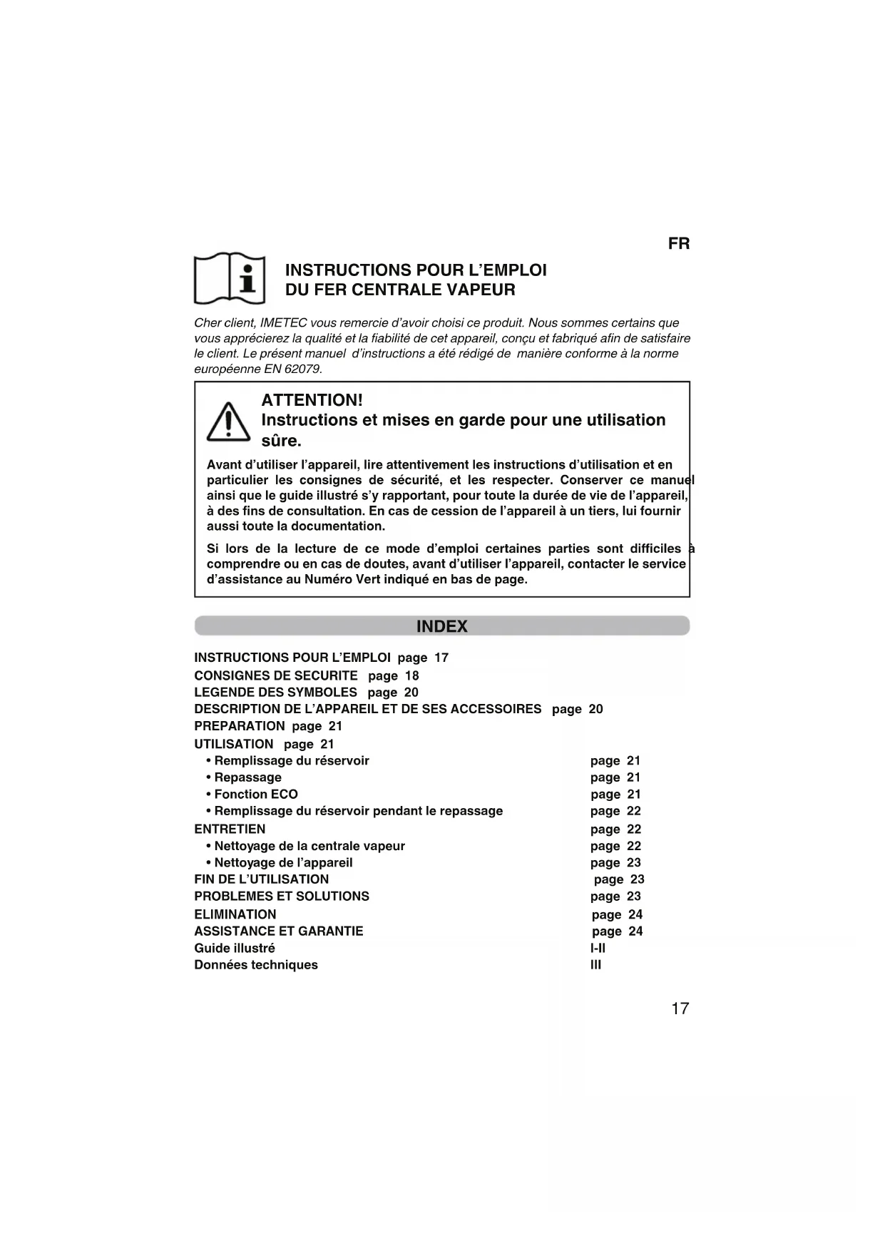 16FR INSTRUCTIONS POUR L’EMPLOI DU FER CENTRALE VAPEUR Cher client, IMETEC vous remercie d’avoir choisi ce produit. Nous sommes certains que