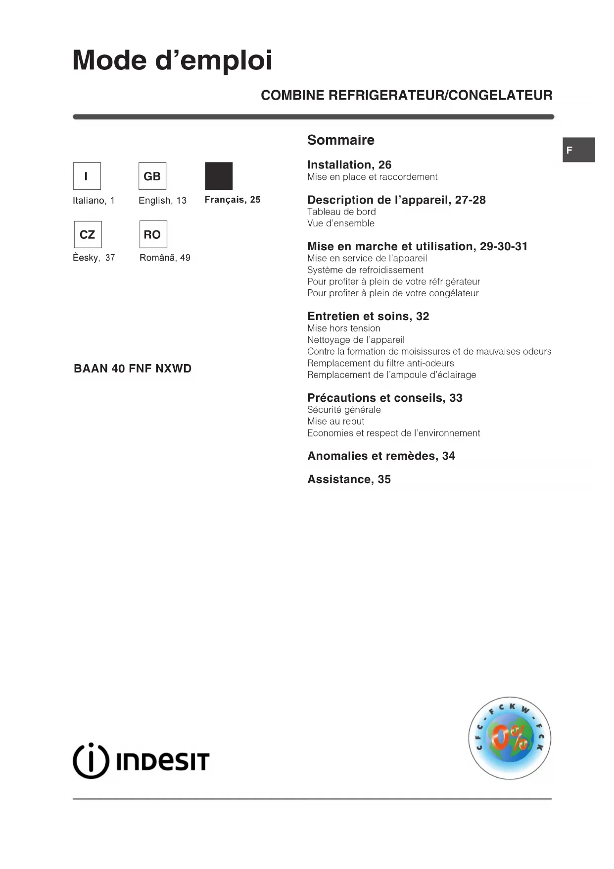 Retrouvez gratuitement la notice de l'appareil BAAN 40 FNF NXWD INDESIT au format PDF.