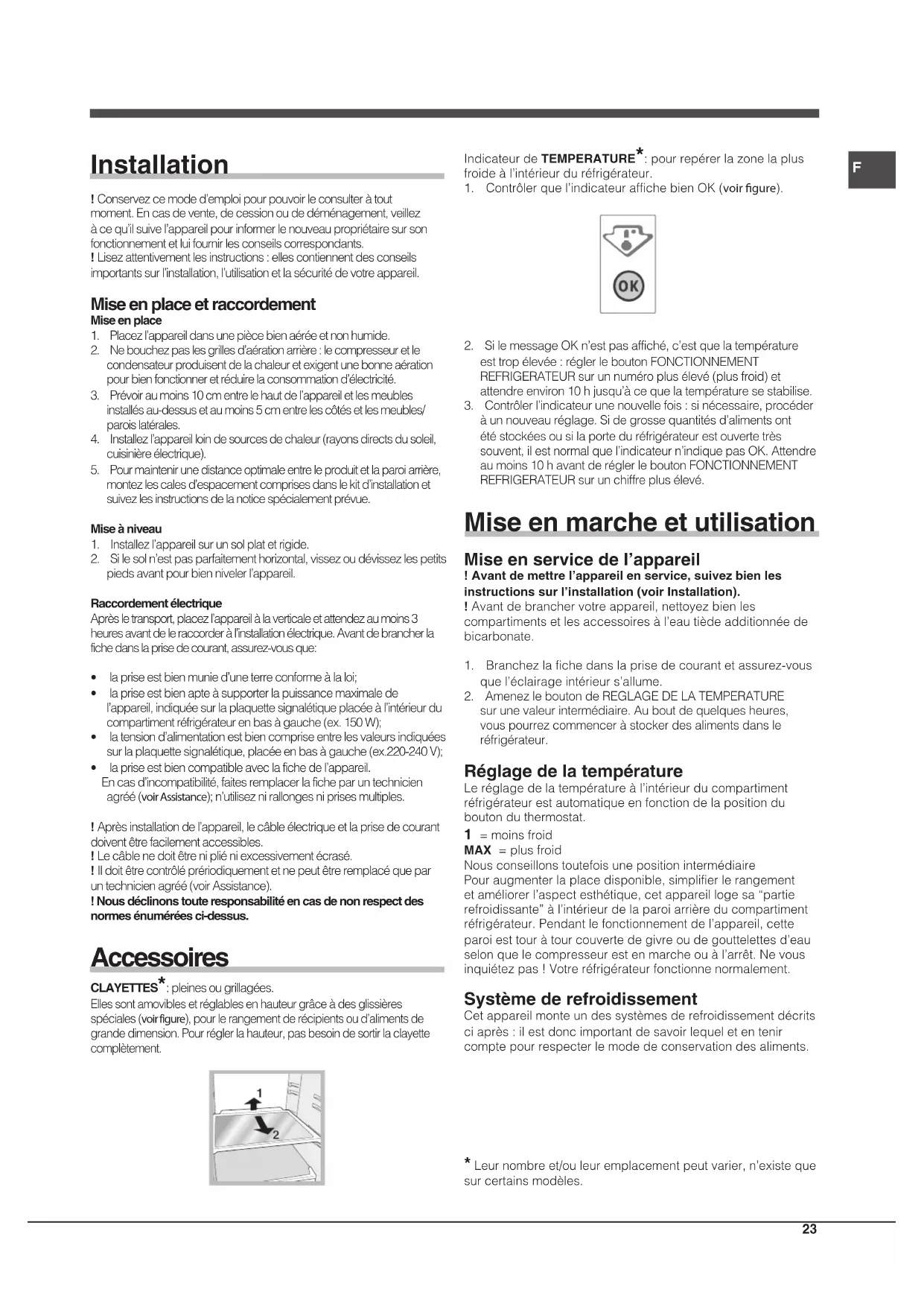 Installation !Conservezcemoded’emploipourpouvoirleconsulteràtoutmoment.Encasdevente,decessionoudedéménagement,veillezàcequ’ilsuivel’appareilpourinformerlenouveaupropriétairesursonfonctionnementetluifournirlesconseilscorrespondants.!Lisezattentivementlesinstructions:ellescontiennentdesconseilsimportantssurl’installation,l’utilisationetlasécuritédevotreappareil. Mise en place et raccordement Mise en place1. Placezl’appareildansunepiècebienaéréeetnonhumide.2. Nebouchezpaslesgrillesd’aérationarrière:lecompresseuretlecondensateurproduisentdelachaleuretexigentunebonneaérationpourbienfonctionneretréduirelaconsommationd’électricité.3. Prévoiraumoins10cmentrelehautdel’appareiletlesmeublesinstallésau-dessusetaumoins5cmentrelescôtésetlesmeubles/parois latérales.4. Installezl’appareilloindesourcesdechaleur(rayonsdirectsdusoleil,cuisinièreélectrique).5. Pourmaintenirunedistanceoptimaleentreleproduitetlaparoiarrière,montezlescalesd’espacementcomprisesdanslekitd’installationetsuivezlesinstructionsdelanoticespécialementprévue.Mise à niveau1. Installezl’appareilsurunsolplatetrigide.2. Silesoln’estpasparfaitementhorizontal,vissezoudévissezlespetitspiedsavantpourbiennivelerl’appareil.Raccordement électriqueAprèsletransport,placezl’appareilàlaverticaleetattendezaumoins3heuresavantdeleraccorderàl’installationélectrique.Avantdebrancherlafichedanslaprisedecourant,assurez-vousque:• lapriseestbienmunied’uneterreconformeàlaloi;• lapriseestbienapteàsupporterlapuissancemaximaledel’appareil,indiquéesurlaplaquettesignalétiqueplacéeàl’intérieurducompartimentréfrigérateurenbasàgauche(ex.150W);• latensiond’alimentationestbiencompriseentrelesvaleursindiquéessurlaplaquettesignalétique,placéeenbasàgauche(ex.220-240V);• lapriseestbiencompatibleaveclafichedel’appareil. Encasd’incompatibilité,faitesremplacerlaficheparuntechnicienagréé(voir Assistance);n’utiliseznirallongesniprisesmultiples.!Aprèsinstallationdel’appareil,lecâbleélectriqueetlaprisedecourantdoiventêtrefacilementaccessibles.!Lecâblenedoitêtrenipliéniexcessivementécrasé.! Ildoitêtrecontrôléprériodiquementetnepeutêtreremplacéqueparuntechnicienagréé(voirAssistance).! Nous déclinons toute responsabilité en cas de non respect des normes énumérées ci-dessus. Accessoires CLAYETTES*:pleinesougrillagées.Ellessontamoviblesetréglablesenhauteurgrâceàdesglissières spéciales (voir figure),pourlerangementderécipientsoud’alimentsde grandedimension.Pourréglerlahauteur,pasbesoindesortirlaclayettecomplètement. IndicateurdeTEMPERATURE*:pourrepérerlazonelaplus froideàl’intérieurduréfrigérateur.1. Contrôlerquel’indicateuraffichebienOK(voir gure). 2. SilemessageOKn’estpasaffiché,c’estquelatempératureesttropélevée:réglerleboutonFONCTIONNEMENTREFRIGERATEURsurunnuméroplusélevé(plusfroid)etattendreenviron10hjusqu’àcequelatempératuresestabilise.3. Contrôlerl’indicateurunenouvellefois:sinécessaire,procéderàunnouveauréglage.Sidegrossequantitésd’alimentsontétéstockéesousilaporteduréfrigérateurestouvertetrèssouvent,ilestnormalquel’indicateurn’indiquepasOK.Attendreaumoins10havantderéglerleboutonFONCTIONNEMENTREFRIGERATEURsurunchiffreplusélevé. Mise en marche et utilisation Mise en service de l’appareil ! Avant de mettre l’appareil en service, suivez bien les instructions sur l’installation (voir Installation).!Avantdebranchervotreappareil,nettoyezbienlescompartimentsetlesaccessoiresàl’eautièdeadditionnéedebicarbonate.1. Branchezlafichedanslaprisedecourantetassurez-vousquel’éclairageintérieurs’allume.2. AmenezleboutondeREGLAGEDELATEMPERATUREsurunevaleurintermédiaire.Auboutdequelquesheures,vouspourrezcommenceràstockerdesalimentsdansleréfrigérateur. Réglage de la température Leréglagedelatempératureàl’intérieurducompartimentréfrigérateurestautomatiqueenfonctiondelapositionduboutonduthermostat. 1 =moinsfroid MAX=plusfroidNousconseillonstoutefoisunepositionintermédiairePouraugmenterlaplacedisponible,simplifierlerangementetaméliorerl’aspectesthétique,cetappareillogesa“partierefroidissante”àl’intérieurdelaparoiarrièreducompartimentréfrigérateur.Pendantlefonctionnementdel’appareil,cetteparoiesttouràtourcouvertedegivreoudegouttelettesd’eauselonquelecompresseurestenmarcheouàl’arrêt.Nevousinquiétezpas!Votreréfrigérateurfonctionnenormalement. Système de refroidissement Cetappareilmonteundessystèmesderefroidissementdécritsciaprès:ilestdoncimportantdesavoirlequeletentenircomptepourrespecterlemodedeconservationdesaliments. *Leurnombreet/ouleuremplacementpeutvarier,n’existeque surcertainsmodèles.24