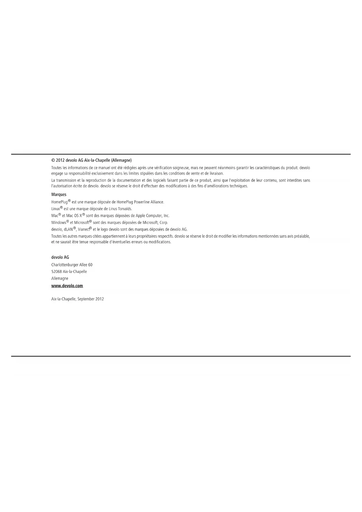 et le logo devolo sont des marques déposées de devolo AG. Toutes les autres marques citées appartiennent à leurs propriétaires respectifs. devolo se réserve le droit de modifier les informations mentionnées sans avis préalable, et ne saurait être tenue responsable d'éventuelles erreurs ou modifications. devolo AG Charlottenburger Allee 60 52068 Aix-la-Chapelle Allemagne www.devolo.com Aix-la-Chapelle, September 2012Contenu devolo dLAN 200 AVpro mini Contenu 1 Avant-propos . . . . . . . . . . . . . . . . . . . . . . . . . . . . . . . . . . . . . . . . . . . . . . . . . . . . . . . . . . . . . . . .5 1.1 Merci de votre confiance ! . . . . . . . . . . . . . . . . . . . . . . . . . . . . . . . . . . . . . . . . . . . . . . . . .5