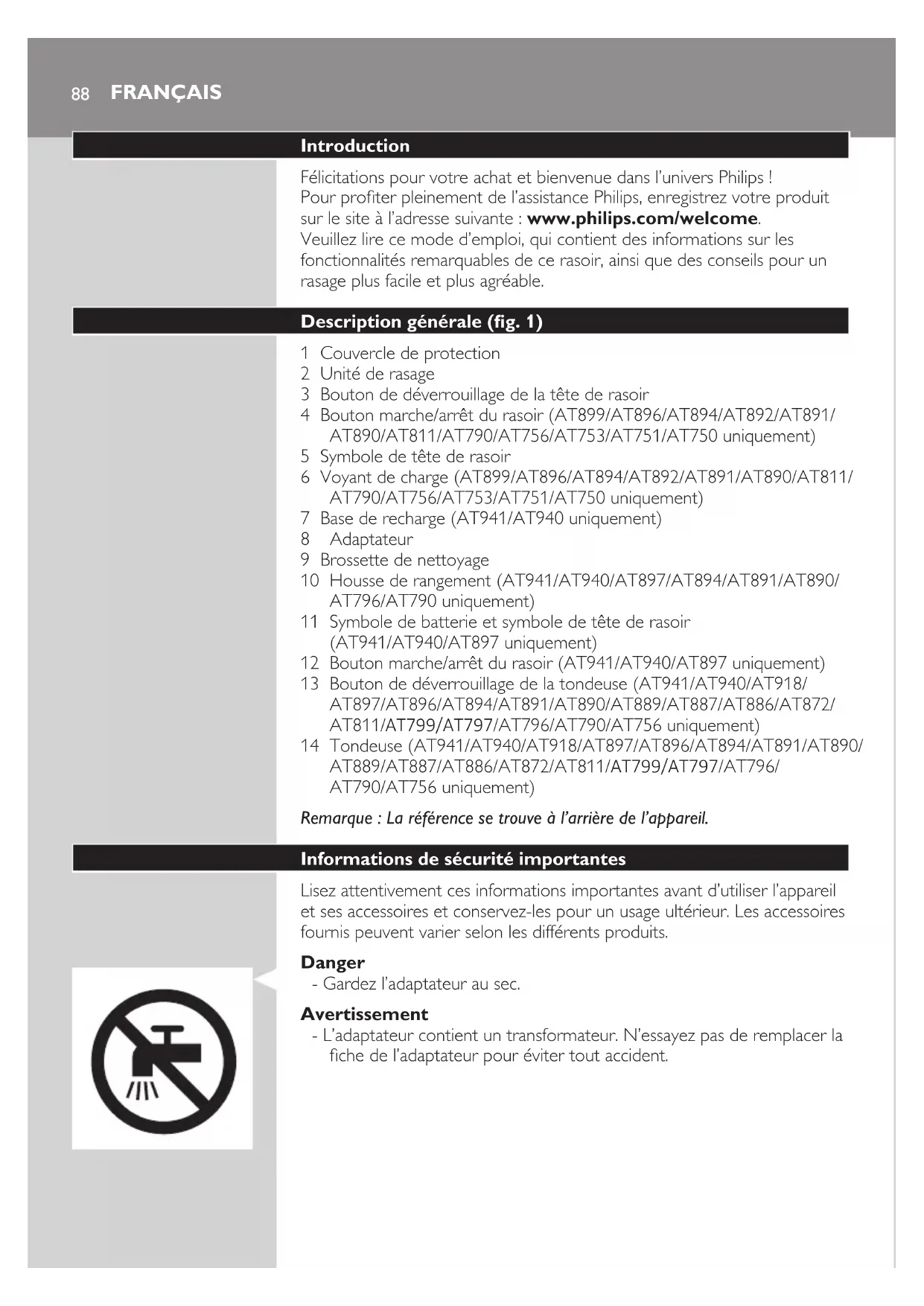 5 sec. SUOMI 85Tarvikkeiden tilaaminen Voit ostaa lisävarusteita ja varaosia osoitteessa www.shop.philips.com/service tai Philips-jälleenmyyjältä. Voit myös ottaa yhteyden Philipsin kuluttajapalvelukeskukseen (katso yhteystiedot kansainvälisestä takuulehtisestä). Jotta parranajokoneesi pysyisi hyvässä toimintakunnossa, puhdista se säännöllisesti ja vaihda teräyksiköt suositusten mukaisesti. Teräyksiköt - Parranajokoneen ajopäät kannattaa vaihtaa kahden vuoden välein. Vaihda ajopäät aina Philipsin HQ9-ajopäihin (mallit AT941/AT940) tai HQ8-ajopäihin (mallit AT897/AT896/AT894/AT891/AT890/ AT889/AT887/AT886/AT872/AT811/ AT799/AT797/AT796/AT790/ AT770/AT756/AT753/AT751/AT750). Puhdistaminen - Puhdista teräyksiköt perusteellisesti puhdistussuihkeella (HQ110). Kierrätys - Tämä merkki tarkoittaa, että tuote kuuluu Euroopan parlamentin ja neuvoston direktiivin 2012/19/EU soveltamisalaan. - Tämä merkki tarkoittaa, että tuote sisältää kiinteän ladattavan akun, joka kuuluu Euroopan parlamentin ja neuvoston direktiivin 2006/66/EY soveltamisalaan ja jota ei saa hävittää tavallisen kotitalousjätteen mukana. Suosittelemme, että viet laitteen viralliseen keräyspisteeseen tai Philipsin valtuuttamaan huoltoliikkeeseen, jossa ammattilaiset irrottavat akun. - Tutustu paikalliseen sähkö- ja elektroniikkalaitteiden sekä akkujen keräysjärjestelmään. Noudata paikallisia säädöksiä äläkä hävitä tuotetta tai akkuja tavallisen kotitalousjätteen mukana. Vanhojen tuotteiden ja akkujen asianmukainen hävittäminen auttaa ehkäisemään ympäristölle ja ihmisille koituvia haittavaikutuksia. Parranajokoneen akun poistaminen Poista akut ennen parranajokoneen hävittämistä. Varmista, että akut ovat täysin tyhjät, kun poistat ne. 1 Irrota parranajokoneen takaosan ja karvakammion ruuvit. 2 Irrota etu- ja takapaneeli. 3 Taivuta syrjään 6 kiinnikettä ja irrota virtayksikkö. Ole varovainen, sillä kiinnikkeet ovat teräviä. 4 Poista ladattava akku. SUOMI86Takuu ja tuki Jos haluat tukea tai lisätietoja, käy Philipsin verkkosivuilla osoitteessa www.philips.com/support tai lue erillinen kansainvälinen takuulehtinen. Takuun rajoitukset Kansainvälinen takuu ei koske teräyksikköjä (terät ja teräsäleiköt), koska ne kuluvat käytössä. Vianmääritys Tähän osaan on koottu tavallisimmat laitteen käytössä ilmenevät ongelmat. Ellet löydä ongelmaasi ratkaisua seuraavista tiedoista, lue osoitteesta www.philips.com/support vastauksia usein kysyttyihin kysymyksiin tai ota yhteys maasi asiakaspalveluun. Ongelma Mahdollinen syy Ratkaisu Parranajokone ei toimi enää niin hyvin kuin aluksi. Teräyksiköt ovat vahingoittuneet tai kuluneet. Vaihda teräyksiköt (katso kohtaa Varaosat). Vaahdon tai geelin jäännökset tukkivat teräyksiköt. Huuhtele ajopää kuumalla juoksevalla vedellä (katso kohta Puhdistus ja hoito). Pitkät karvat haittaavat teräyksiköiden toimintaa. Puhdista ajopäät yksi kerrallaan (katso kohta Puhdistus ja hoito). Teräyksiköt eivät ole kunnolla paikoillaan. Tarkista, että ajopäät asettuvat kunnolla syvennyksiin (katso kohta Puhdistus ja hoito). Parranajokone ei käynnisty, kun virtakytkintä painetaan. Ladattava akku on tyhjä. Lataa akku (katso luku Lataaminen). Parranajokone on lämmennyt liikaa. Siinä tapauksessa parranajokone ei toimi. Kun parranajokoneen lämpötila on laskenut riittävästi, voit käynnistää sen uudelleen. Parranajokone ei toimi, vaikka se on liitetty verkkovirtaan. Parranajokonetta ei voi käyttää verkkovirralla. Lataa akku (katso kohta Lataaminen) ja irrota parranajokoneen virtajohto pistorasiasta. SUOMI 8788 Introduction Félicitations pour votre achat et bienvenue dans l’univers Philips ! Pour proter pleinement de l’assistance Philips, enregistrez votre produit sur le site à l’adresse suivante : www.philips.com/welcome. Veuillez lire ce mode d’emploi, qui contient des informations sur les fonctionnalités remarquables de ce rasoir, ainsi que des conseils pour un rasage plus facile et plus agréable. Description générale (g. 1) 1 Couvercle de protection 2 Unité de rasage 3 Bouton de déverrouillage de la tête de rasoir 4 Bouton marche/arrêt du rasoir (AT899/AT896/AT894/AT892/AT891/ AT890/AT811/AT790/AT756/AT753/AT751/AT750 uniquement) 5 Symbole de tête de rasoir 6 Voyant de charge (AT899/AT896/AT894/AT892/AT891/AT890/AT811/ AT790/AT756/AT753/AT751/AT750 uniquement) 7 Base de recharge (AT941/AT940 uniquement) 8 Adaptateur 9 Brossette de nettoyage 10 Housse de rangement (AT941/AT940/AT897/AT894/AT891/AT890/ AT796/AT790 uniquement) 11 Symbole de batterie et symbole de tête de rasoir (AT941/AT940/AT897 uniquement) 12 Bouton marche/arrêt du rasoir (AT941/AT940/AT897 uniquement) 13 Bouton de déverrouillage de la tondeuse (AT941/AT940/AT918/ AT897/AT896/AT894/AT891/AT890/AT889/AT887/AT886/AT872/ AT811/ AT799/AT797/AT796/AT790/AT756 uniquement) 14 Tondeuse (AT941/AT940/AT918/AT897/AT896/AT894/AT891/AT890/ AT889/AT887/AT886/AT872/AT811/AT799/AT797/AT796/ AT790/AT756 uniquement) Remarque : La référence se trouve à l’arrière de l’appareil. Informations de sécurité importantes Lisez attentivement ces informations importantes avant d’utiliser l’appareil et ses accessoires et conservez-les pour un usage ultérieur. Les accessoires fournis peuvent varier selon les différents produits. Danger - Gardez l’adaptateur au sec. Avertissement - L’adaptateur contient un transformateur. N’essayez pas de remplacer la che de l’adaptateur pour éviter tout accident. FRANÇAIS- Cet appareil peut être utilisé par des enfants âgés de 8 ans ou plus, des personnes dont les capacités physiques, sensorielles ou intellectuelles sont réduites ou des personnes manquant d’expérience et de connaissances, à condition que ces enfants ou personnes soient sous surveillance ou qu’ils aient reçu des instructions quant à l’utilisation sécurisée de l’appareil et qu’ils aient pr