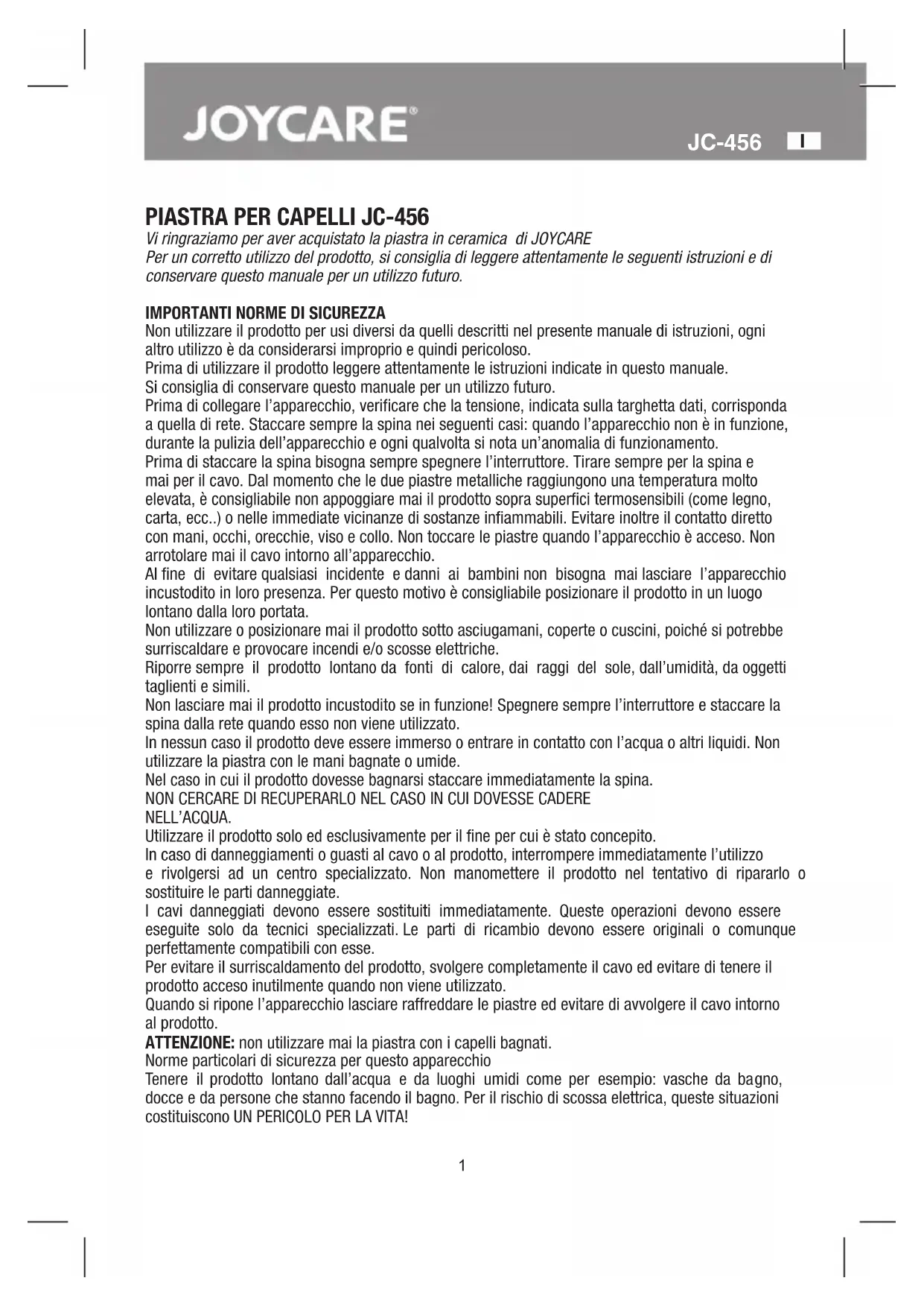 LISSEUR JC-456 Nous vous remercions d’avoir acheté le Lisseur céramique JOYCARE.. Pour une utilisation correcte et en toute sécurité,avant d’utiliser l’appareil,on conseille de lire attentivement les instructions suivantes. On conseille en outre de conserver cemanuel pour une utilisation future.