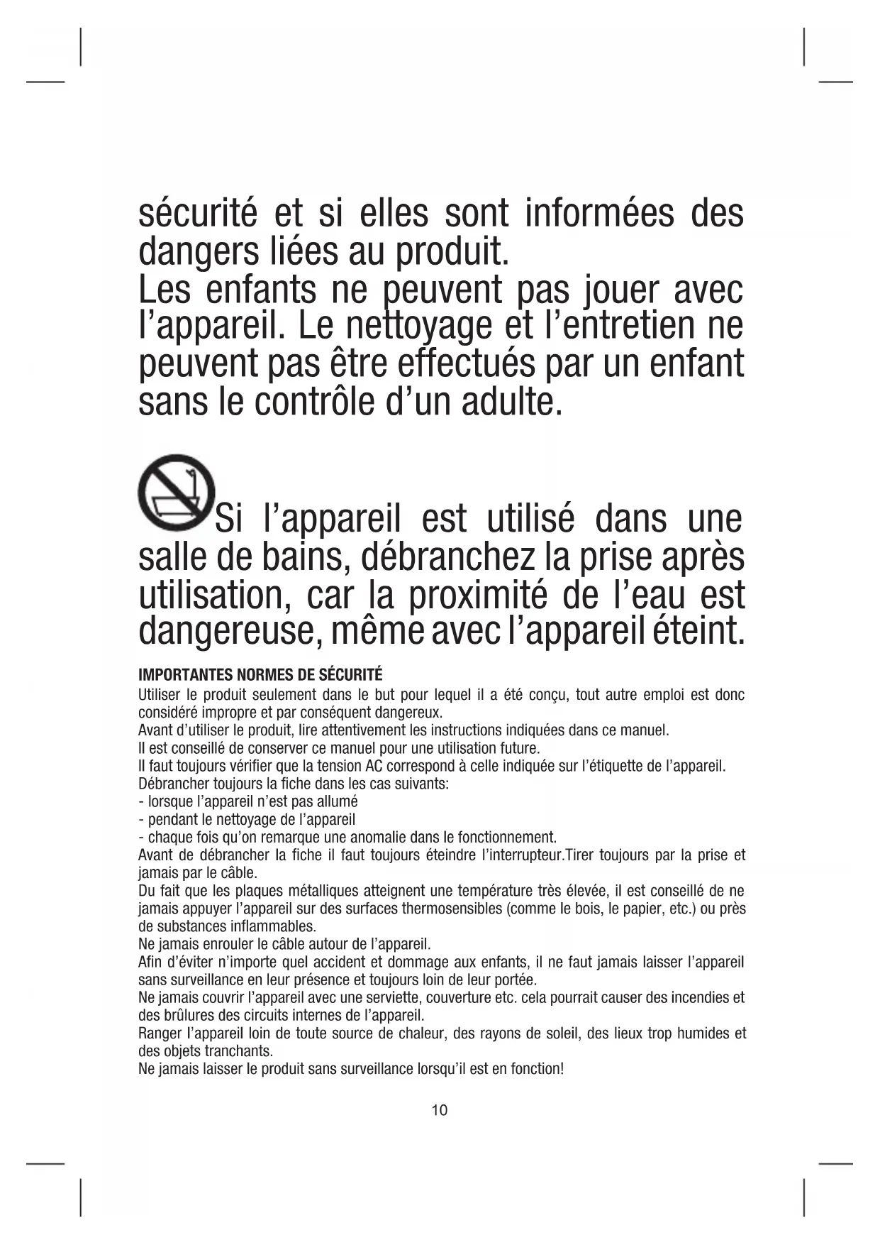 sécurité et si elles sont informées des dangers liées au produit. Les enfants ne peuvent pas jouer avec l’appareil. Le nettoyage et l’entretien ne peuvent pas être effectués par un enfant sans le contrôle d’un adulte. Si l’appareil est utilisé dans une salle de bains, débranchez la prise après utilisation, car la proximité de l’eau est dangereuse, même avec l’appareil éteint.