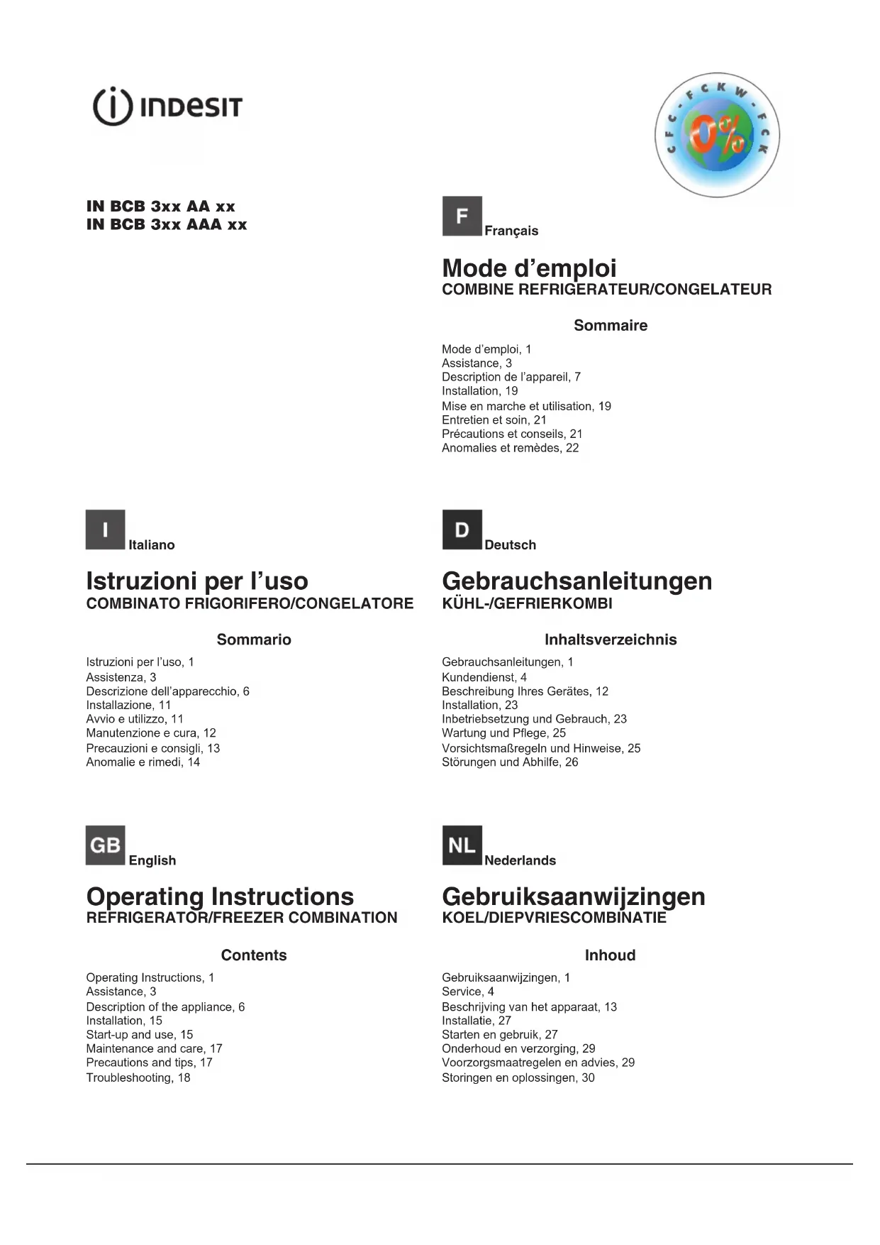 Retrouvez gratuitement la notice de l'appareil IN CB 33 AA INDESIT au format PDF.