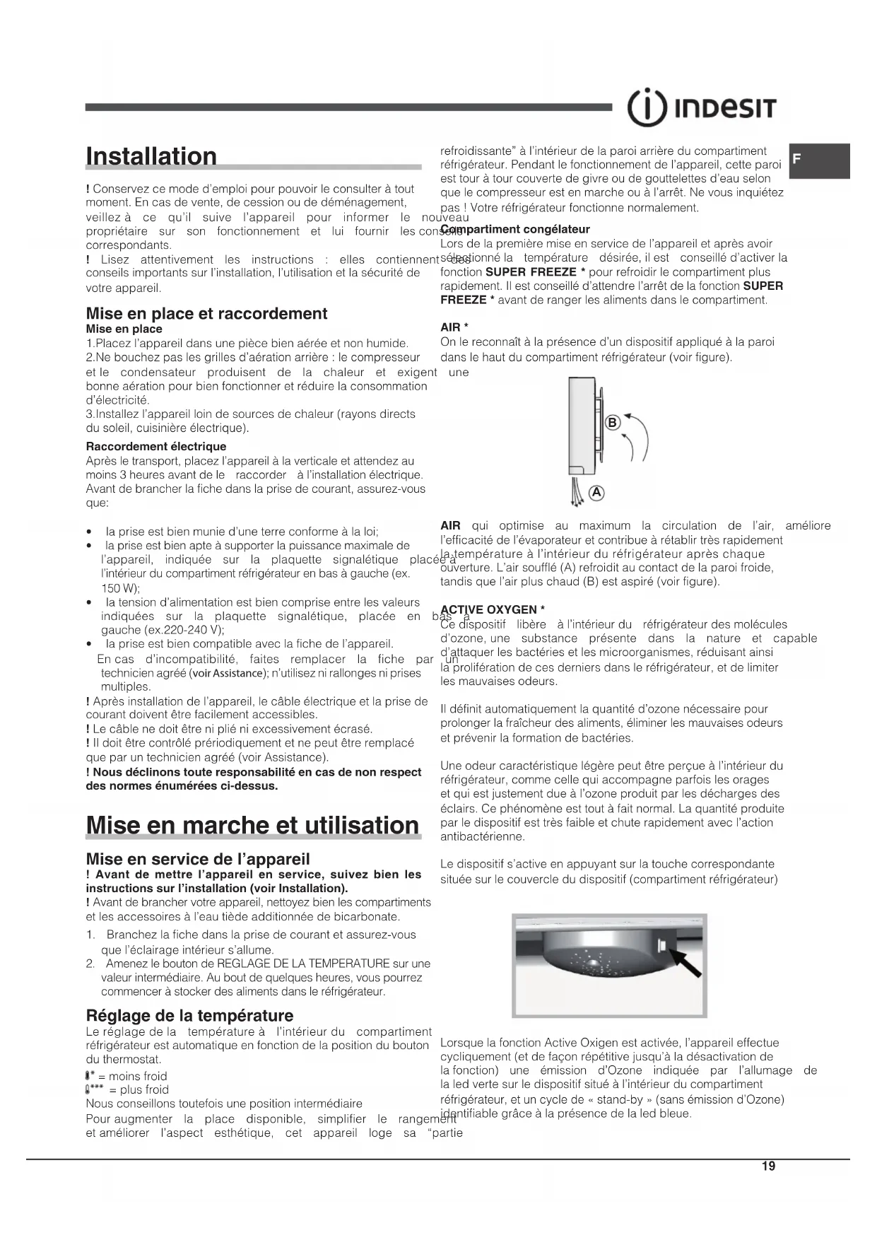 AIR qui optimise au maximum la circulation de l’air, améliore l’efficacitédel’évaporateuretcontribueàrétablirtrèsrapidement latempératureàl’intérieurduréfrigérateuraprèschaque ouverture.L’airsoufflé(A)refroiditaucontactdelaparoifroide, tandisquel’airpluschaud(B)estaspiré(voirfigure). ACTIVE OXYGEN * Cedispositif libère àl’intérieurdu réfrigérateurdesmolécules d’ozone,une substance présente dans la nature et capable d’attaquerlesbactériesetlesmicroorganismes,réduisantainsi laproliférationdecesderniersdansleréfrigérateur,etdelimiter lesmauvaisesodeurs. Ildéfinitautomatiquementlaquantitéd’ozonenécessairepour prolongerlafraîcheurdesaliments,éliminerlesmauvaisesodeurs etprévenirlaformationdebactéries. Uneodeurcaractéristiquelégèrepeutêtreperçueàl’intérieurdu réfrigérateur,commecellequiaccompagneparfoislesorages etquiestjustementdueàl’ozoneproduitparlesdéchargesdes éclairs.Cephénomèneesttoutàfaitnormal.Laquantitéproduite parledispositifesttrèsfaibleetchuterapidementavecl’action antibactérienne. Ledispositifs’activeenappuyantsurlatouchecorrespondante situéesurlecouvercledudispositif(compartimentréfrigérateur) LorsquelafonctionActiveOxigenestactivée,l’appareileffectue cycliquement(etdefaçonrépétitivejusqu’àladésactivationde lafonction) une émission d’Ozone indiquée par l’allumage de laledvertesurledispositifsituéàl’intérieurducompartiment réfrigérateur,etuncyclede«stand-by»(sansémissiond’Ozone) identifiablegrâceàlaprésencedelaledbleue.20