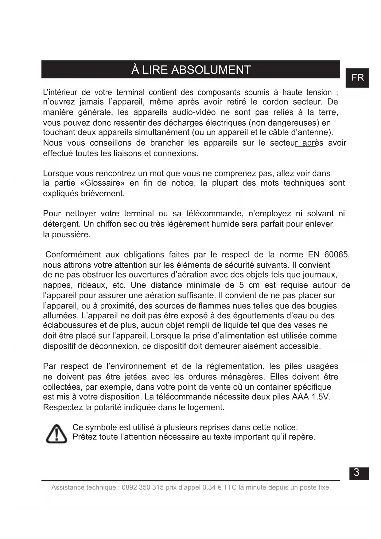 À LIRE ABSOLUMENT L’intérieur de votre terminal contient des composants soumis à haute tension ; n’ouvrez jamais l’appareil, même après avoir retiré le cordon secteur. De manière générale, les appareils audio-vidéo ne sont pas reliés à la terre, vous pouvez donc ressentir des décharges électriques (non dangereuses) en touchant deux appareils simultanément (ou un appareil et le câble d’antenne). Nous vous conseillons de brancher les appareils sur le secteur après avoir effectué toutes les liaisons et connexions. Lorsque vous rencontrez un mot que vous ne comprenez pas, allez voir dans la partie «Glossaire» en fin de notice, la plupart des mots techniques sont expliqués brièvement. Pour nettoyer votre terminal ou sa télécommande, n’employez ni solvant ni détergent. Un chiffon sec ou très légèrement humide sera parfait pour enlever la poussière. Conformément aux obligations faites par le respect de la norme EN 60065, nous attirons votre attention sur les éléments de sécurité suivants. Il convient de ne pas obstruer les ouvertures d’aération avec des objets tels que journaux, nappes, rideaux, etc. Une distance minimale de 5 cm est requise autour de l’appareil pour assurer une aération sufsante. Il convient de ne pas placer sur l’appareil, ou à proximité, des sources de ammes nues telles que des bougies allumées. L’appareil ne doit pas être exposé à des égouttements d’eau ou des éclaboussures et de plus, aucun objet rempli de liquide tel que des vases ne doit être placé sur l’appareil. Lorsque la prise d’alimentation est utilisée comme dispositif de déconnexion, ce dispositif doit demeurer aisément accessible. Par respect de l’environnement et de la réglementation, les piles usagées ne doivent pas être jetées avec les ordures ménagères. Elles doivent être collectées, par exemple, dans votre point de vente où un container spécique est mis à votre disposition. La télécommande nécessite deux piles AAA 1.5V. Respectez la polarité indiquée dans le logement. Ce symbole est utilisé à plusieurs reprises dans cette notice. Prêtez toute l’attention nécessaire au texte important qu’il repère.4 Assistance technique : 0892 350 315 prix d’appel 0,34 € TTC la minute depuis un poste xe.