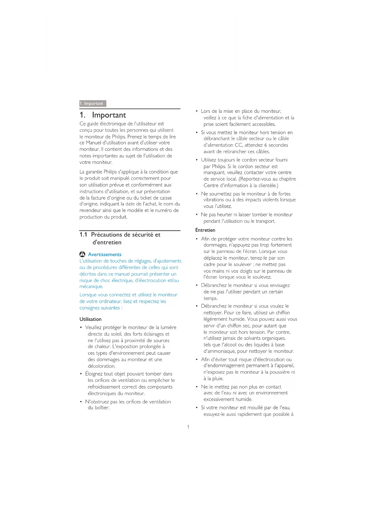 Ce guide électronique de l’utilisateur est conçu pour toutes les personnes qui utilisent le moniteur de Philips. Prenez le temps de lire ce Manuel d'utilisation avant d’utiliser votre moniteur. Il contient des informations et des notes importantes au sujet de l'utilisation de votre moniteur. La garantie Philips s'applique à la condition que le produit soit manipulé correctement pour son utilisation prévue et conformément aux instructions d'utilisation, et sur présentation de la facture d'origine ou du ticket de caisse d'origine, indiquant la date de l'achat, le nom du revendeur ainsi que le modèle et le numéro de production du produit.