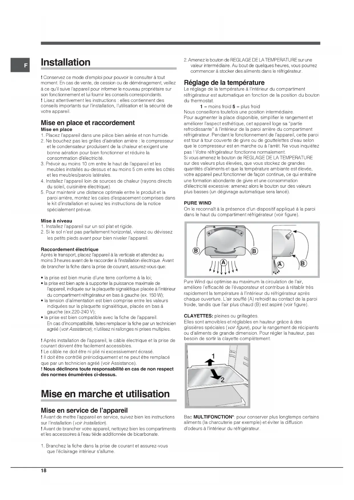 Installation ! Conservez ce mode d’emploi pour pouvoir le consulter à toutmoment. En cas de vente, de cession ou de déménagement, veillezà ce qu’il suive l’appareil pour informer le nouveau propriétaire surson fonctionnement et lui fournir les conseils correspondants.! Lisez attentivement les instructions : elles contiennent desconseils importants sur l’installation, l’utilisation et la sécurité devotre appareil. Mise en place et raccordement Mise en place1. Placez l’appareil dans une pièce bien aérée et non humide.2. Ne bouchez pas les grilles d’aération arrière : le compresseuret le condensateur produisent de la chaleur et exigent unebonne aération pour bien fonctionner et réduire laconsommation d’électricité.3. Prévoir au moins 10 cm entre le haut de l’appareil et lesmeubles installés au-dessus et au moins 5 cm entre les côtéset les meubles/parois latérales.4. Installez l’appareil loin de sources de chaleur (rayons directsdu soleil, cuisinière électrique).5. Pour maintenir une distance optimale entre le produit et laparoi arrière, montez les cales d’espacement comprises dansle kit d’installation et suivez les instructions de la noticespécialement prévue.Mise à niveau1. Installez l’appareil sur un sol plat et rigide.2. Si le sol n’est pas parfaitement horizontal, vissez ou dévissezles petits pieds avant pour bien niveler l’appareil.Raccordement électriqueAprès le transport, placez l’appareil à la verticale et attendez aumoins 3 heures avant de le raccorder à l’installation électrique. Avantde brancher la fiche dans la prise de courant, assurez-vous que:• la prise est bien munie d’une terre conforme à la loi;• la prise est bien apte à supporter la puissance maximale del’appareil, indiquée sur la plaquette signalétique placée à l’intérieurdu compartiment réfrigérateur en bas à gauche (ex. 150 W);• la tension d’alimentation est bien comprise entre les valeursindiquées sur la plaquette signalétique, placée en bas àgauche (ex.220-240 V);• la prise est bien compatible avec la fiche de l’appareil.En cas d’incompatibilité, faites remplacer la fiche par un technicien agréé (voir Assistance); n’utilisez ni rallonges ni prises multiples. ! Après installation de l’appareil, le câble électrique et la prise decourant doivent être facilement accessibles.! Le câble ne doit être ni plié ni excessivement écrasé.! Il doit être contrôlé prériodiquement et ne peut être remplacéque par un technicien agréé (voir Assistance).! Nous déclinons toute responsabilité en cas de non respectdes normes énumérées ci-dessus. Mise en marche et utilisation Mise en service de l’appareil ! Avant de mettre l’appareil en service, suivez bien les instructionssur l’installation (voir Installation).! Avant de brancher votre appareil, nettoyez bien les compartimentset les accessoires à l’eau tiède additionnée de bicarbonate.1. Branchez la fiche dans la prise de courant et assurez-vousque l’éclairage intérieur s’allume.2. Amenez le bouton de REGLAGE DE LA TEMPERATURE sur unevaleur intermédiaire. Au bout de quelques heures, vous pourrezcommencer à stocker des aliments dans le réfrigérateur. Réglage de la température Le réglage de la température à l’intérieur du compartimentréfrigérateur est automatique en fonction de la position du boutondu thermostat.1 = moins froid 5 = plus froidNous conseillons toutefois une position intermédiaire.Pour augmenter la place disponible, simplifier le rangement etaméliorer l’aspect esthétique, cet appareil loge sa “partierefroidissante” à l’intérieur de la paroi arrière du compartimentréfrigérateur. Pendant le fonctionnement de l’appareil, cette paroiest tour à tour couverte de givre ou de gouttelettes d’eau selonque le compresseur est en marche ou à l’arrêt. Ne vous inquiétezpas ! Votre réfrigérateur fonctionne normalement.Si vous amenez le bouton de REGLAGE DE LA TEMPERATUREsur des valeurs plus élevées, que vous stockez de grandesquantités d’aliments et que la température ambiante est élevée,votre appareil peut fonctionner de façon continue, ce qui entraîneune formation abondante de givre et une consommationd’électricité excessive: amenez alors le bouton sur des valeursplus basses (un dégivrage automatique sera lancé).PURE WINDOn le reconnaît à la présence d’un dispositif appliqué à la paroidans le haut du compartiment réfrigérateur (voir figure).