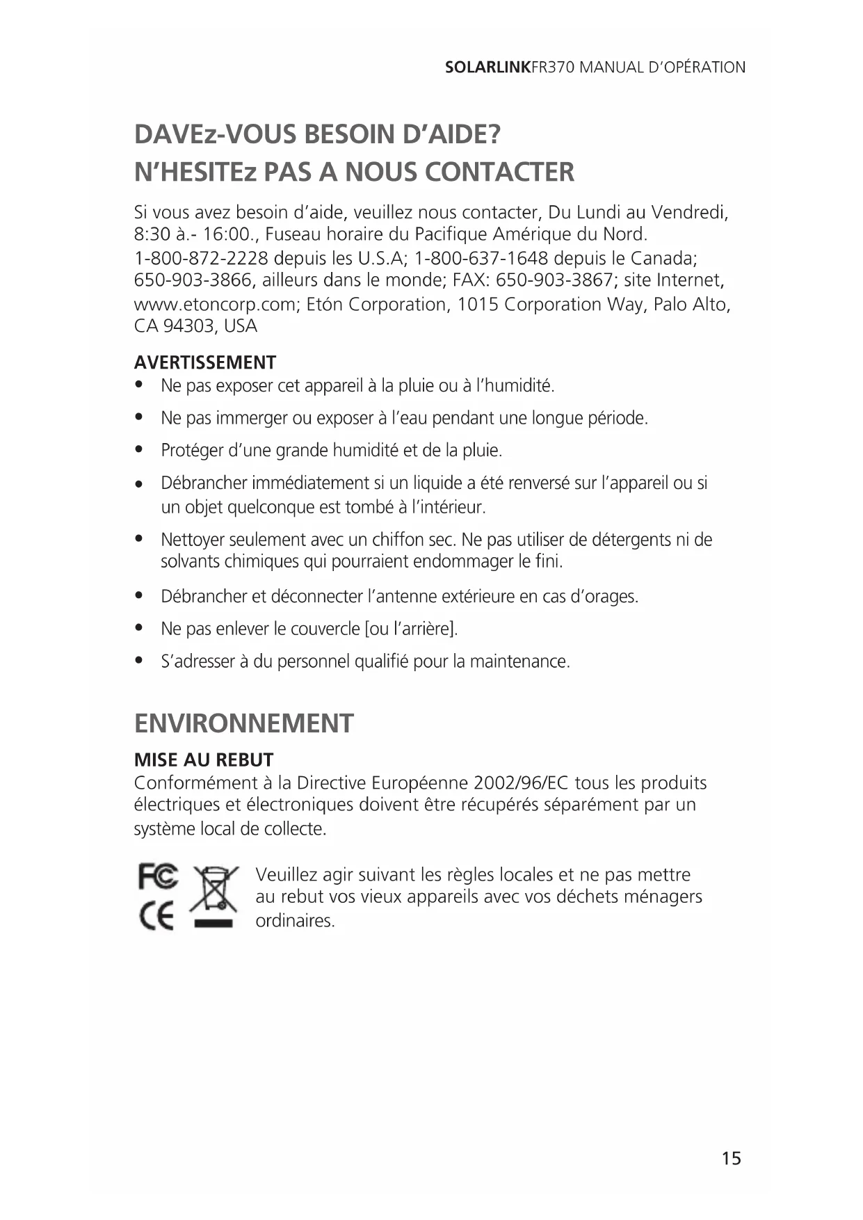 1-800-872-2228 depuis les U.S.A; 1-800-637-1648 depuis le Canada; 650-903-3866, ailleurs dans le monde; FAX: 650-903-3867; site Internet, www.etoncorp.com; Etón Corporation, 1015 Corporation Way, Palo Alto, CA 94303, USA