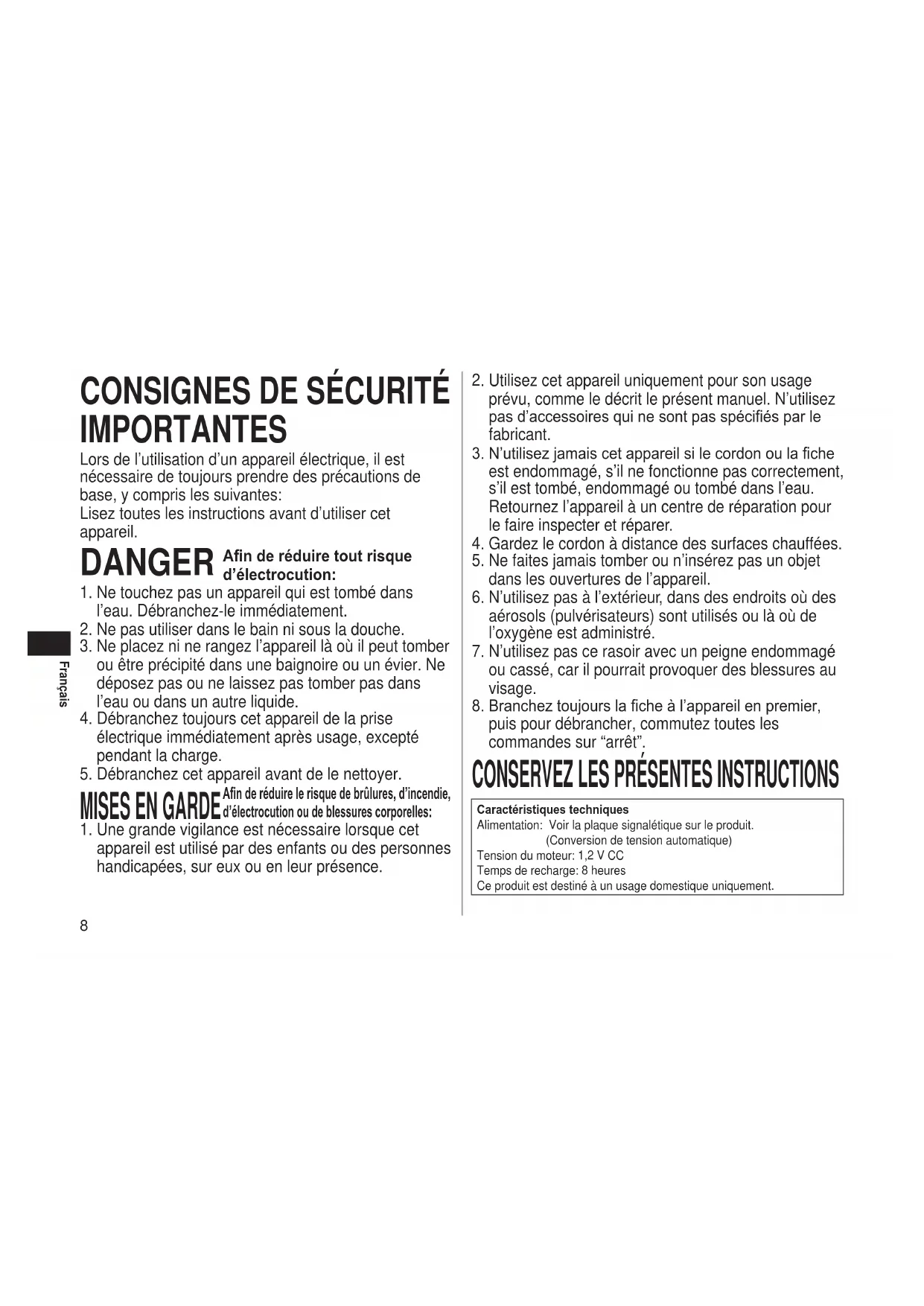CONSERVEZ LES PRÉSENTES INSTRUCTIONS Caractéristiques techniques