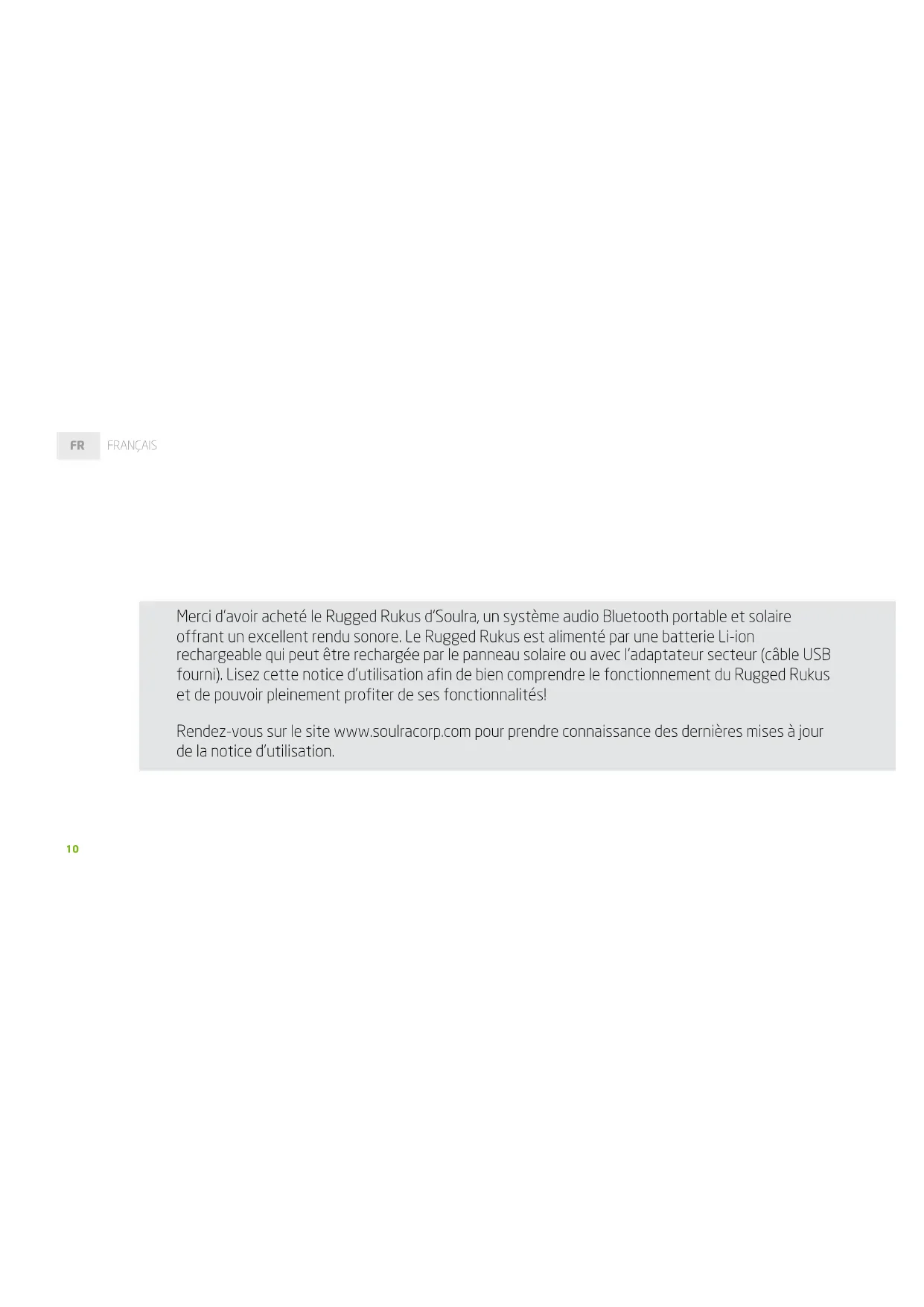Merci d'avoir acheté le Rugged Rukus d'Soulra, un système audio Bluetooth portable et solaire offrant un excellent rendu sonore. Le Rugged Rukus est alimenté par une batterie Li-ion rechargeable qui peut être rechargée par le panneau solaire ou avec l'adaptateur secteur (cable USB fourni). Lisez cette notice d'utilisation afin de bien comprendre le fonctionnement du Rugged Rukus et de pouvoir pleinement profiter de ses fonctionnalités!