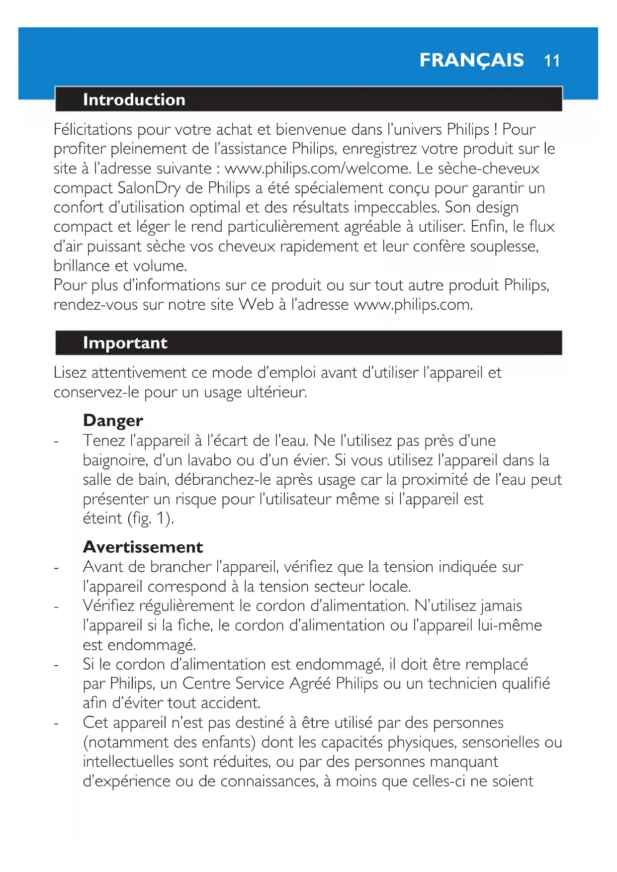ENGLISH 9Troubleshooting If problems arise with your hairdryer and you cannot solve them with the information below, please contact the nearest Philips service centre or the Philips Consumer Care Centre in your country. Problem Solution The appliance does not work at all. Perhaps the socket to which the appliance has been connected is not live. Make sure the socket is live. The appliance may have overheated and switched itself off. Unplug the appliance and let it cool down for a few minutes. Before you switch on the appliance again, check the grilles to make sure they are not blocked by uff, hair, etc. The appliance may not be suitable for the voltage to which it has been connected. Make sure that the voltage indicated on the type plate of the appliance corresponds to the local mains voltage. The mains cord may be damaged. If the mains cord is damaged, you must have it replaced by Philips, a service centre authorised by Philips or similarly qualied persons in order to avoid a hazard. EnglisH1011 Introduction Félicitations pour votre achat et bienvenue dans l’univers Philips ! Pour proter pleinement de l’assistance Philips, enregistrez votre produit sur le site à l’adresse suivante : www.philips.com/welcome. Le sèche-cheveux compact SalonDry de Philips a été spécialement conçu pour garantir un confort d’utilisation optimal et des résultats impeccables. Son design compact et léger le rend particulièrement agréable à utiliser. Enn, le ux d’air puissant sèche vos cheveux rapidement et leur confère souplesse, brillance et volume. Pour plus d’informations sur ce produit ou sur tout autre produit Philips, rendez-vous sur notre site Web à l’adresse www.philips.com. Important Lisez attentivement ce mode d’emploi avant d’utiliser l’appareil et conservez-le pour un usage ultérieur. Danger Tenez l’appareil à l’écart de l’eau. Ne l’utilisez pas près d’une baignoire, d’un lavabo ou d’un évier. Si vous utilisez l’appareil dans la salle de bain, débranchez-le après usage car la proximité de l’eau peut présenter un risque pour l’utilisateur même si l’appareil est éteint (g. 1). Avertissement Avant de brancher l’appareil, vériez que la tension indiquée sur l’appareil correspond à la tension secteur locale. Vériez régulièrement le cordon d’alimentation. N’utilisez jamais l’appareil si la che, le cordon d’alimentation ou l’appareil lui-même est endommagé. Si le cordon d’alimentation est endommagé, il doit être remplacé par Philips, un Centre Service Agréé Philips ou un technicien qualié an d’éviter tout accident. Cet appareil n’est pas destiné à être utilisé par des personnes (notamment des enfants) dont les capacités physiques, sensorielles ou intellectuelles sont réduites, ou par des personnes manquant d’expérience ou de connaissances, à moins que celles-ci ne soient