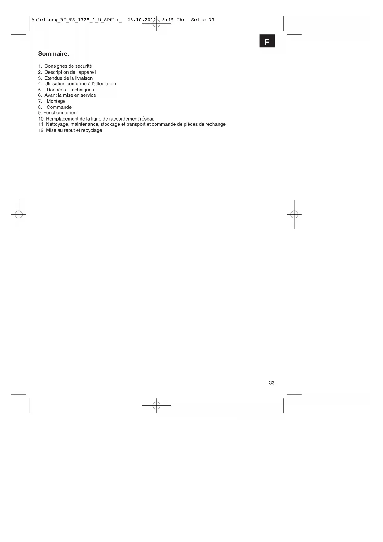 F Anleitung_RT_TS_1725_1_U_SPK1:_ 28.10.2011 8:45 Uhr Seite 43Les piles comprennent des matériaux polluant