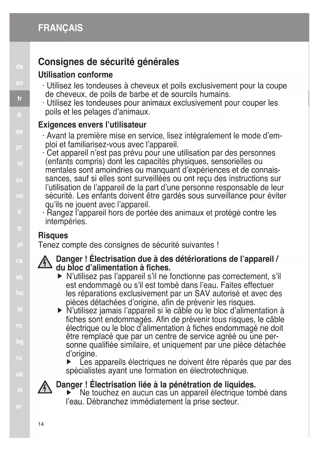 f N’utilisez jamais un appareil électrique dans la baignoire ou sous la douche. f Rangez ou stockez toujours les appareils électriques de sorte à ce qu’ils ne puissent pas tomber dans l’eau (par ex. lavabo). Évitez tout contact d’un appareil électrique avec de l’eau ou tout autre liquide. f Utilisez et rangez l’appareil uniquement dans des endroits secs. f La mise en place d’un dispositif de protection contrôlé à courant différentiel résiduel (RCD) ayant un courant de déclenchement n’excédant pas 30 mA est recommandée à titre de mesure de sécurité supplémentaire dans le circuit électrique de la salle de bain. Risques d’explosion ! f N’utilisez jamais l’appareil dans un environnement dans lequel des aérosols sont utilisés ou dans lequel de l’oxygène est libéré. f N’essayez pas de changer la batterie vous-même. f N’exposez pas l’appareil pendant une durée prolongée à des températures inférieures à 0 °C ou supérieures à +40 °C. Évitez l’exposition aux rayons directs du soleil. Avertissement ! Blessures liées à une utilisation non-conforme. f Pour votre sécurité, n’utilisez jamais l’appareil avec une tête de coupe endommagée. f Éteignez toujours l’appareil avant de le poser, puisque les vibra- tions émises par l’appareil pourraient provoquer sa chute. Attention ! Dommages liés à une tension d’alimentation erronée. f Utilisez l’appareil exclusivement sur du courant alternatif avec la tension indiquée sur la plaque signalétique. Attention ! Dommages liés à une utilisation non-conforme. f Utilisez exclusivement les accessoires recommandés par le fabricant. f Pour charger l’appareil, utilisez exclusivement le bloc d’alimen- tation à fiches fourni. Ne remplacez les blocs d’alimentation à fiches défectueux que par des pièces détachées d’origine que vous pourrez obtenir auprès de notre service après-vente. f N’introduisez jamais et ne laissez jamais tomber des objets dans les ouvertures de l’appareil.FRANÇAIS
