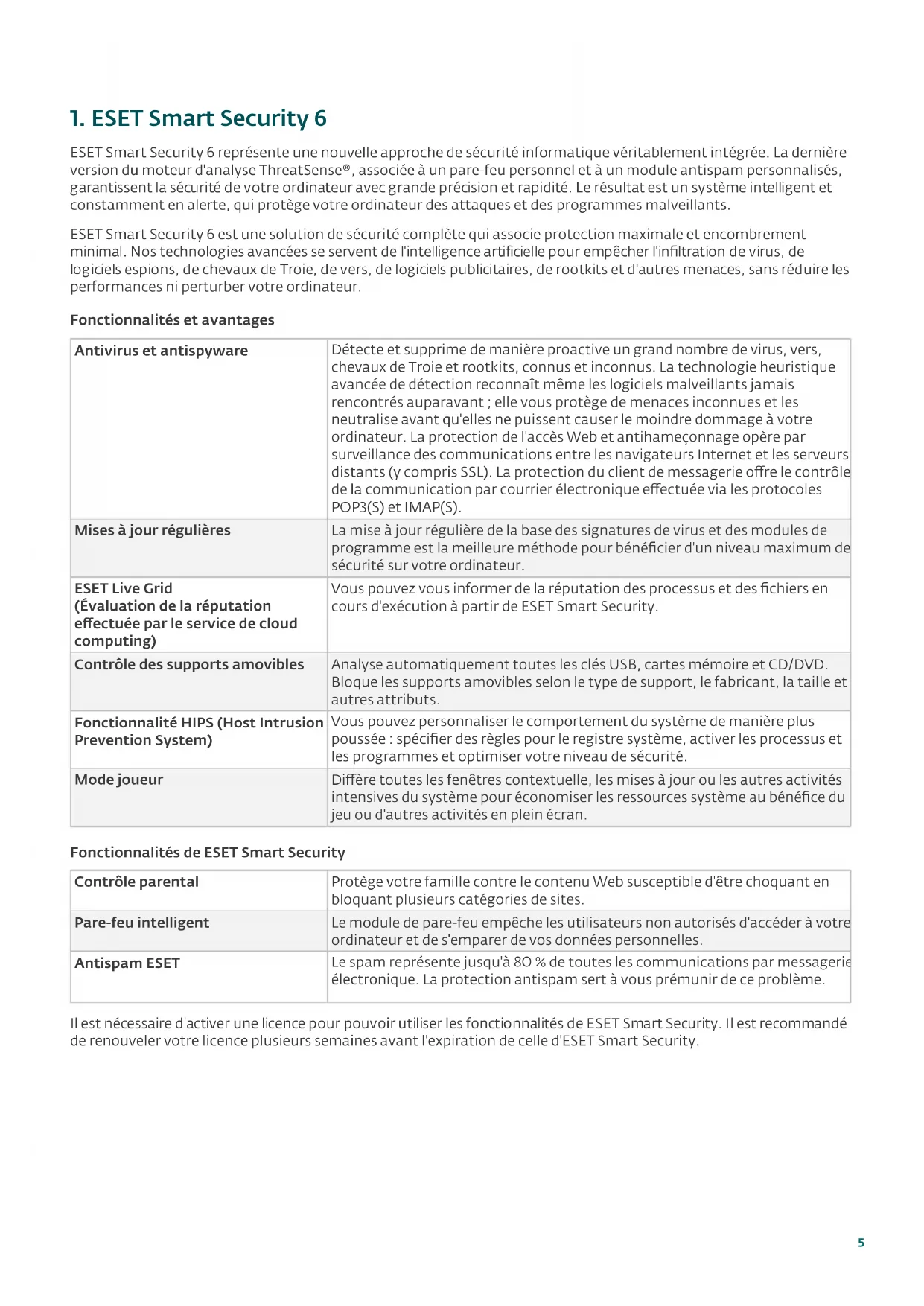 ESET Smart Security 6 représente une nouvelle approche de sécurité informatique véritablement intégrée. La dernière version du moteur d'analyse ThreatSense®, associée à un pare-feu personnel et à un module antispam personnalisés, garantissent la sécurité de votre ordinateur avec grande précision et rapidité. Le résultat est un système intelligent et constamment en alerte, qui protège votre ordinateur des attaques et des programmes malveillants. ESET Smart Security 6 est une solution de sécurité complète qui associe protection maximale et encombrement minimal. Nos technologies avancées se servent de l'intelligence artificielle pour empêcher l'infiltration de virus, de logiciels espions, de chevaux de Troie, de vers, de logiciels publicitaires, de rootkits et d'autres menaces, sans réduire les performances ni perturber votre ordinateur. Fonctionnalités et avantages Antivirus et antispyware Détecte et supprime de manière proactive un grand nombre de virus, vers, chevaux de Troie et rootkits, connus et inconnus. La technologie heuristique avancée de détection reconnaît même les logiciels malveillants jamais rencontrés auparavant ; elle vous protège de menaces inconnues et les neutralise avant qu'elles ne puissent causer le moindre dommage à votre ordinateur. La protection de l'accès Web et antihameçonnage opère par surveillance des communications entre les navigateurs Internet et les serveurs distants (y compris SSL). La protection du client de messagerie offre le contrôle de la communication par courrier électronique effectuée via les protocoles POP3(S) et IMAP(S). Mises à jour régulières La mise à jour régulière de la base des signatures de virus et des modules de programme est la meilleure méthode pour bénéficier d'un niveau maximum de sécurité sur votre ordinateur. ESET Live Grid (Évaluation de la réputation effectuée par le service de cloud computing) Vous pouvez vous informer de la réputation des processus et des fichiers en cours d'exécution à partir de ESET Smart Security. Contrôle des supports amovibles Analyse automatiquement toutes les clés USB, cartes mémoire et CD/DVD. Bloque les supports amovibles selon le type de support, le fabricant, la taille et autres attributs. Fonctionnalité HIPS (Host Intrusion Prevention System) Vous pouvez personnaliser le comportement du système de manière plus poussée : spécifier des règles pour le registre système, activer les processus et les programmes et optimiser votre niveau de sécurité. Mode joueur Diffère toutes les fenêtres contextuelle, les mises à jour ou les autres activités intensives du système pour économiser les ressources système au bénéfice du jeu ou d'autres activités en plein écran. Fonctionnalités de ESET Smart Security Contrôle parental Protège votre famille contre le contenu Web susceptible d'être choquant en bloquant plusieurs catégories de sites. Pare-feu intelligent Le module de pare-feu empêche les utilisateurs non autorisés d'accéder à votre ordinateur et de s'emparer de vos données personnelles. Antispam ESET Le spam représente jusqu'à 80 % de toutes les communications par messagerie électronique. La protection antispam sert à vous prémunir de ce problème. Il est nécessaire d'activer une licence pour pouvoir utiliser les fonctionnalités de ESET Smart Security. Il est recommandé de renouveler votre licence plusieurs semaines avant l'expiration de celle d'ESET Smart Security.6
