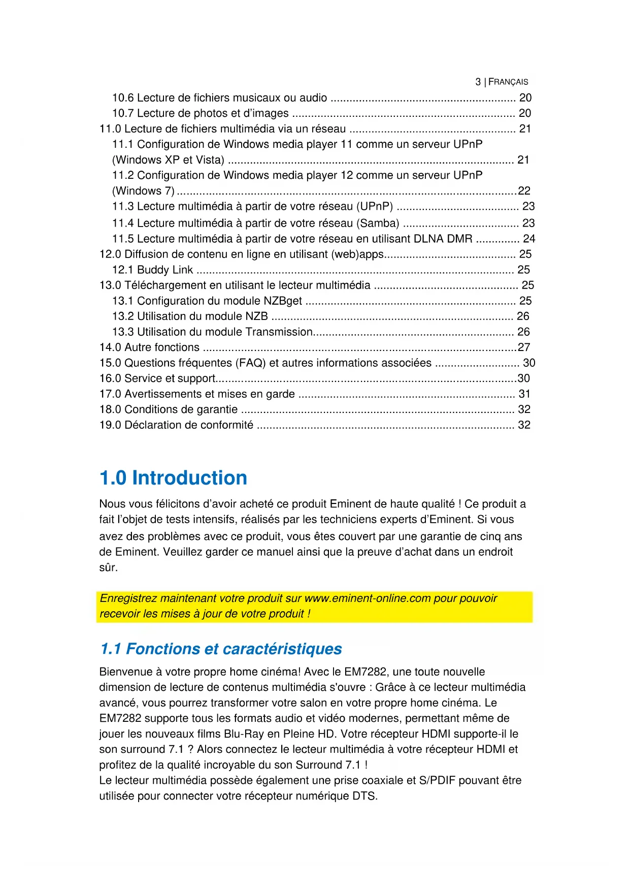 RANÇAIS Lecteur multimédia HD Eminent EM7282 avec DVB-T Table des matières 1.0 Introduction ........................................................................................................... 3