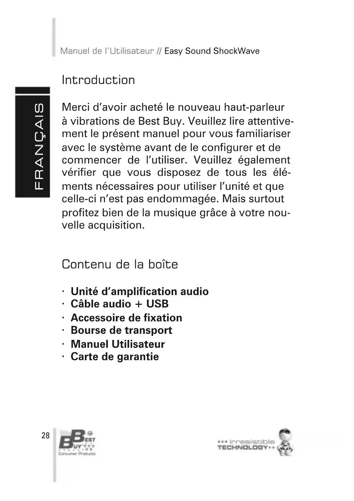 Introduction Merci d’avoir acheté le nouveau haut-parleur à vibrations de Best Buy. Veuillez lire attentive- ment le présent manuel pour vous familiariser avec le système avant de le configurer et de commencer de l’utiliser. Veuillez également vérifier que vous disposez de tous les élé- ments nécessaires pour utiliser l’unité et que celle-ci n’est pas endommagée. Mais surtout profitez bien de la musique grâce à votre nou- velle acquisition. Contenu de la boîte