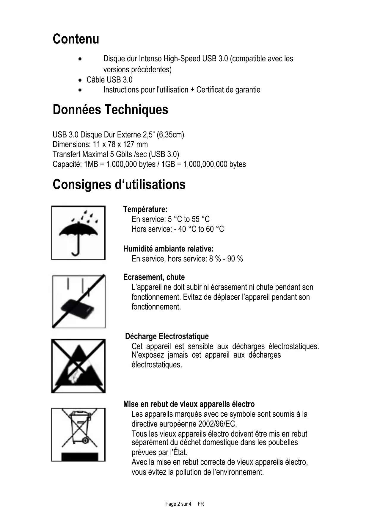 Les réclamations sous garantie ne sont pas prises en compte dans le cas de non respect du manuel d'utilisation d'Intenso ainsi que dans le cas d'assemblage incorrect, d'utilisation ou de défaillances d'autres apparèils.