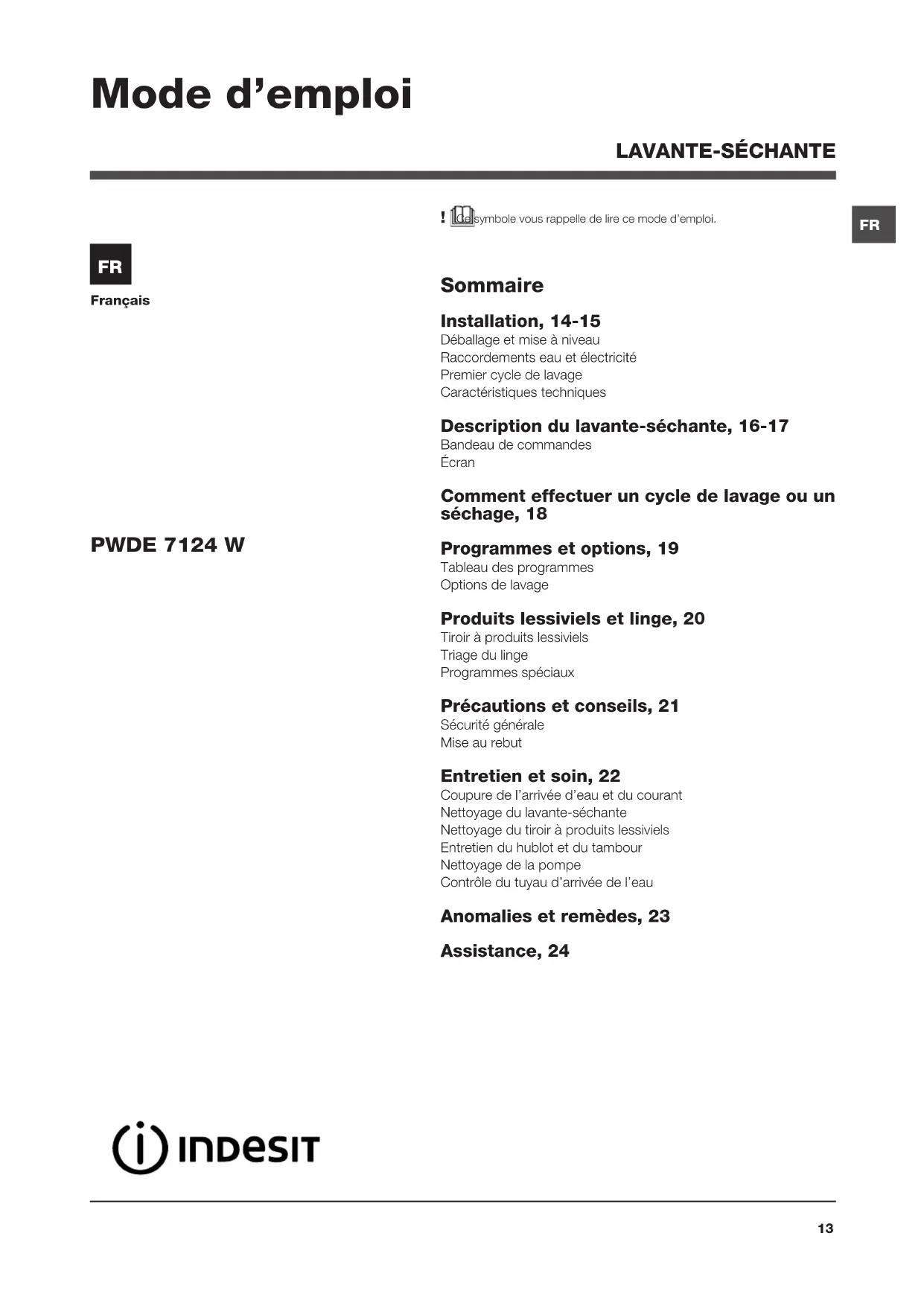 PWDE 7124 S - Machine à laver INDESIT - Notice d'utilisation et mode d'emploi gratuit