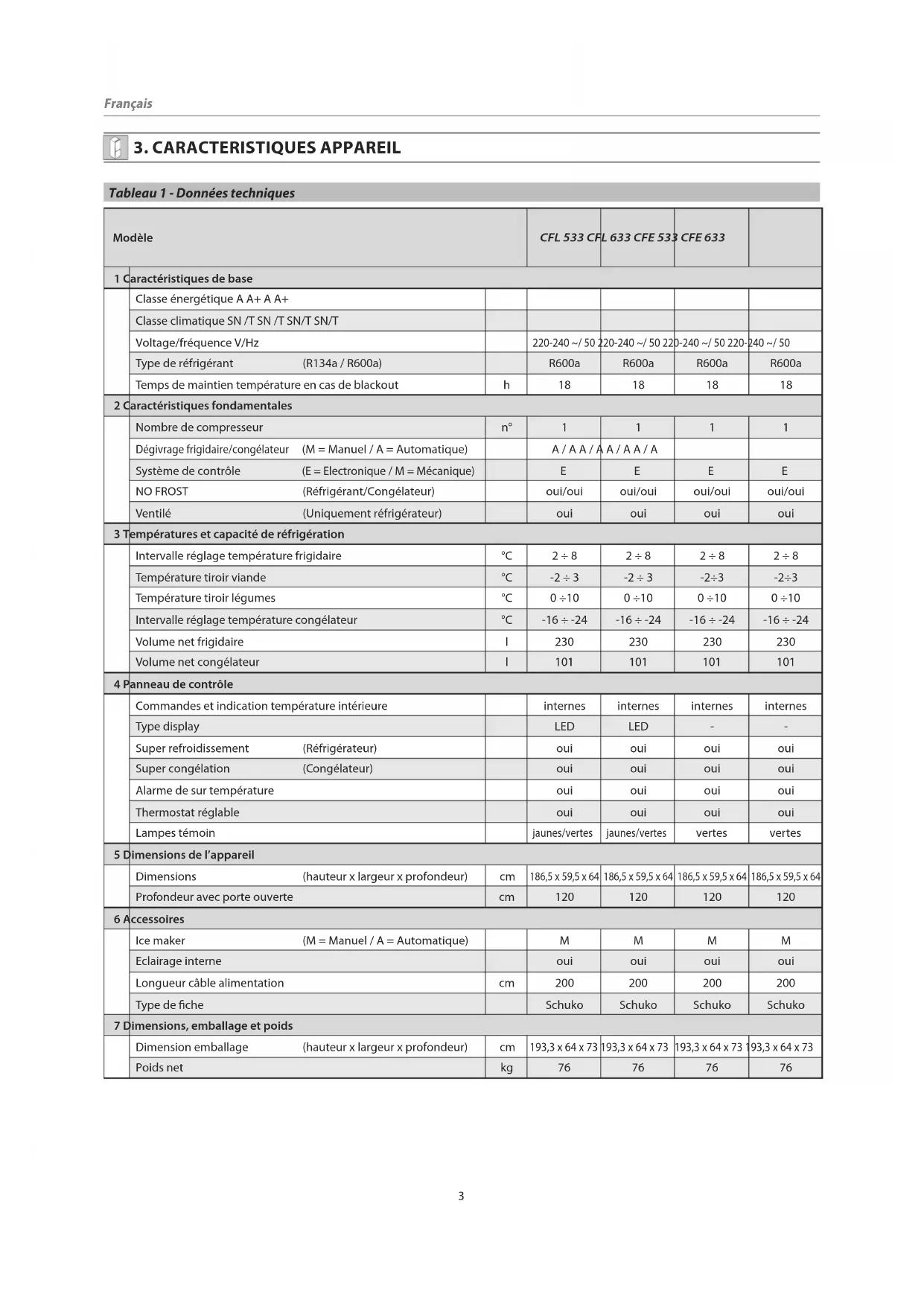 3. CARACTERISTIQUES APPAREIL Tableau 1 - Données techniques