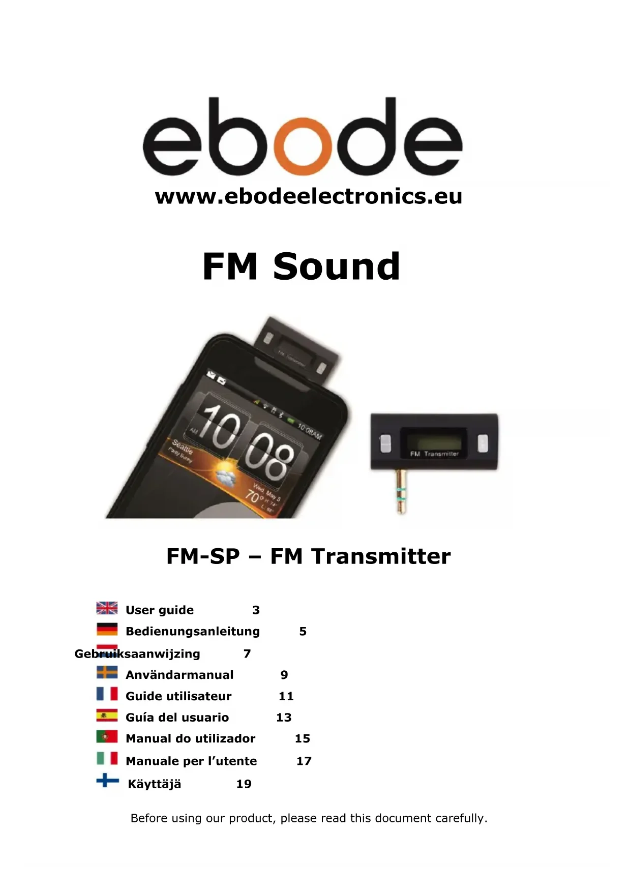 Merci d'avoir acheté l'ebode FM-SP. Maintenant vous pouvez écouter votre musique sur votre (auto) radio.