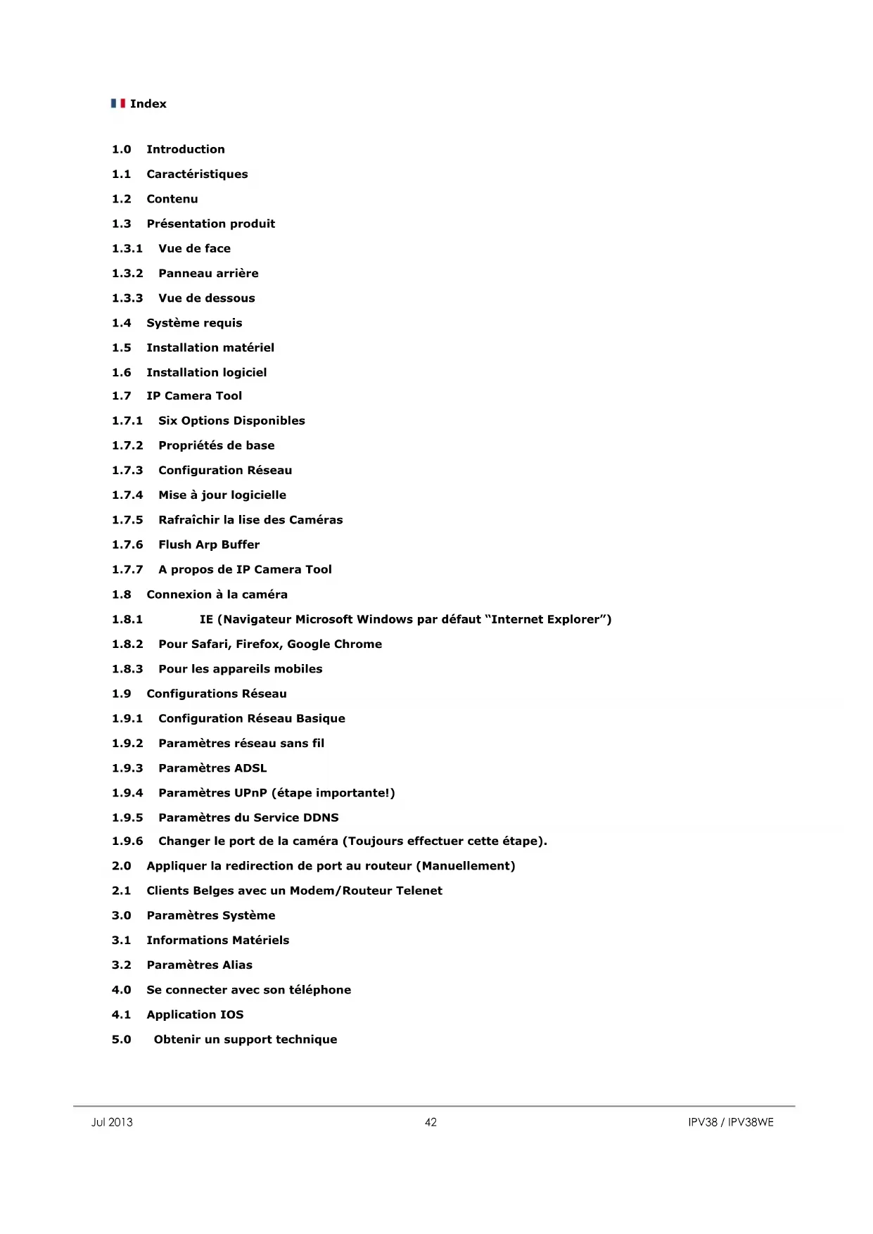 Merci de bien vérifier que tous les objets sont inclus dans votre pack: ● Caméra IP – lentille 6.0mm (IPV38) ou lentille 3.6mm (IPV38WE) ● Alimentation ● Antenne Wi-Fi ● Câble réseau ● Support de fixation ● Guide de démarrage ● CD contenant logiciels et guidesJul 2013 IPV38 / IPV38WE