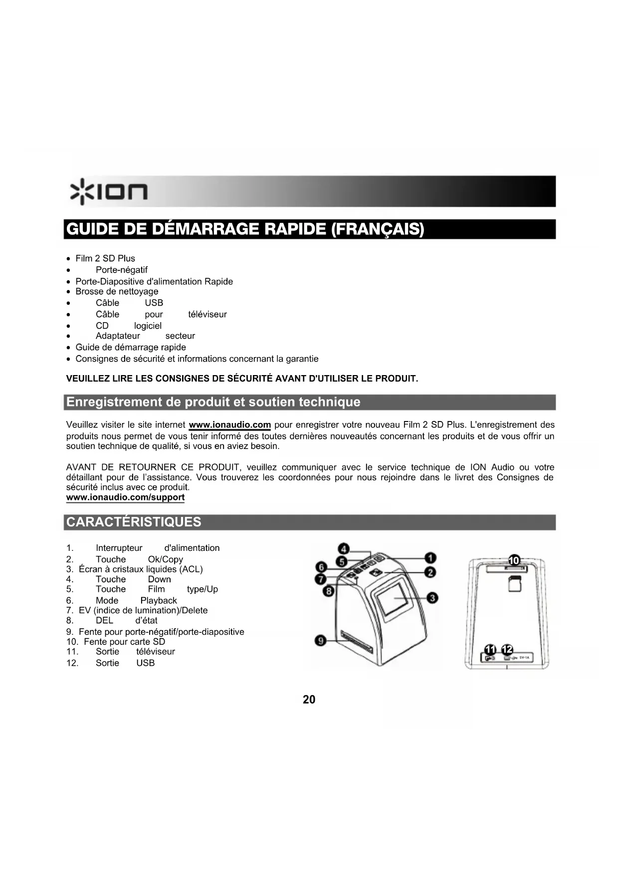 - Film 2 SD Plus • Porte-négatif • Porte-Diapositive d'alimentation Rapide • Brosse de nettoyage • Câble USB • Câble pour téléviseur • CD logiciel • Adaptateur secteur • Guide de démarrage rapide • Consignes de sécurité et informations concernant la garantie VEUILLEZ LIRE LES CONSIGNES DE SÉCURITÉ AVANT D'UTILISER LE PRODUIT. Enregistrement de produit et soutien technique Veuillez visiter le site internet www.ionaudio.com pour enregistrer votre nouveau Film 2 SD Plus. L'enregistrement des produits nous permet de vous tenir informé des toutes dernières nouveautés concernant les produits et de vous offrir un soutien technique de qualité, si vous en aviez besoin. AVANT DE RETOURNER CE PRODUIT, veuillez communiquer avec le service technique de ION Audio ou votre détaillant pour de l’assistance. Vous trouverez les coordonnées pour nous rejoindre dans le livret des Consignes de sécurité inclus avec ce produit. www.ionaudio.com/support CARACTÉRISTIQUES 1. Interrupteur d'alimentation 2. Touche Ok/Copy 3. Écran à cristaux liquides (ACL) 4. Touche Down 5. Touche Film type/Up 6. Mode Playback 7. EV (indice de lumination)/Delete 8. DEL d’état 9. Fente pour porte-négatif/porte-diapositive 10. Fente pour carte SD 11. Sortie téléviseur 12. Sortie USB 5V-1A