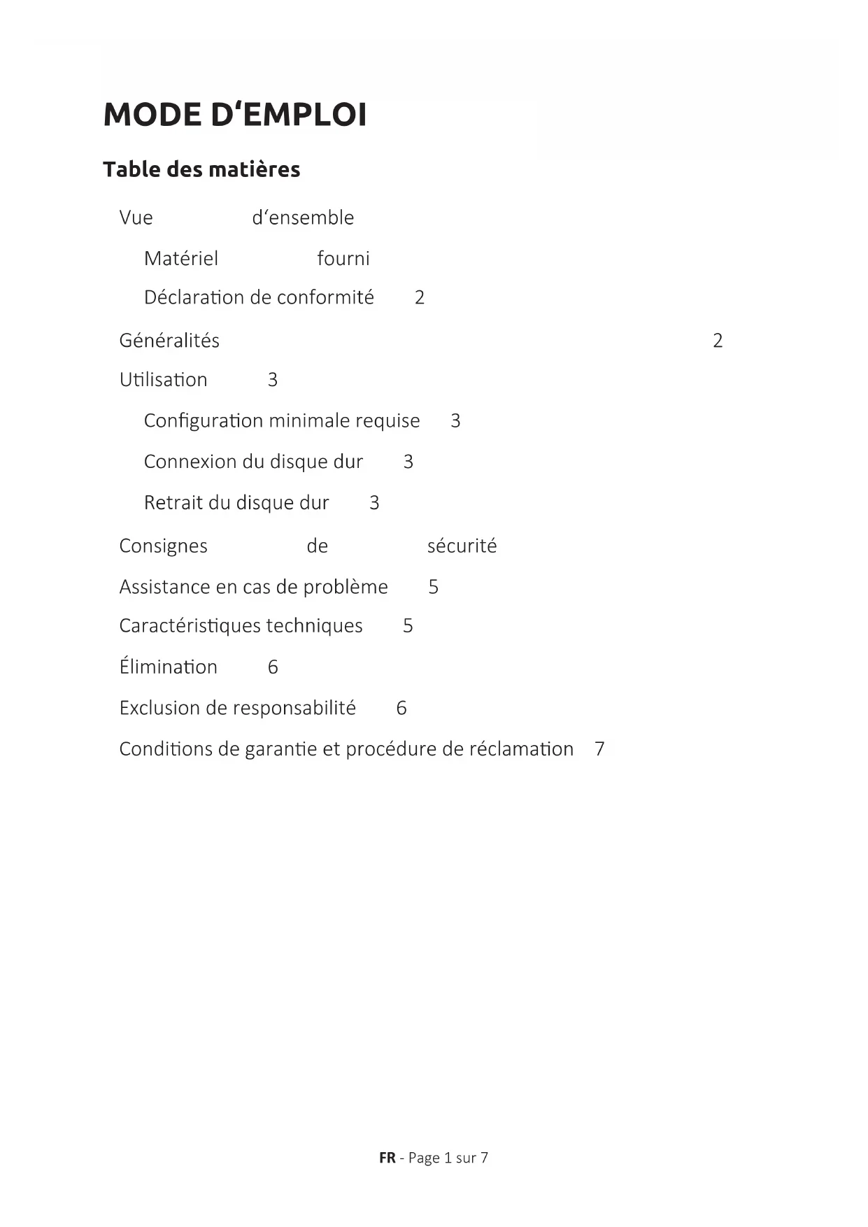 Service Center (your RMA-No.) Kopernikusstraße 12-14 D-49377 Vechta Contact: Email (technical support): support@intenso-internaonal.de Email (RMA-number): rma@intenso-internaonal.de Internet: www.intenso-internaonal.de Service Hotline: +49 (0) 900 –1 50 40 30 (0,39 € / min. from the German xed network mobile phone prices may vary.) Complaints procedure:MODE D‘EMPLOI FR - Page 1 sur 7 Table des matières Vue d‘ensemble 2 Matériel fourni 2 Déclaraon de conformité 2 Généralités 2 Ulisaon 3 Conguraon minimale requise 3 Connexion du disque dur 3 Retrait du disque dur 3 Consignes de sécurité 4 Assistance en cas de problème 5 Caractérisques techniques 5 Éliminaon 6 Exclusion de responsabilité 6 Condions de garane et procédure de réclamaon 7FR - Page 2 sur 7 Veuillez lire a en vement le présent mode d‘emploi et observer et respecter l‘ensemble des consignes gurant dans le présent mode d‘emploi a n de garan r une longue durée de vie et une u lisa on able de l‘appareil. Conservez le présent mode d‘emploi à portée de main et transme ez-le aux autres u lisateurs de l‘appareil le cas échéant. À propos de ce mode d‘emploi