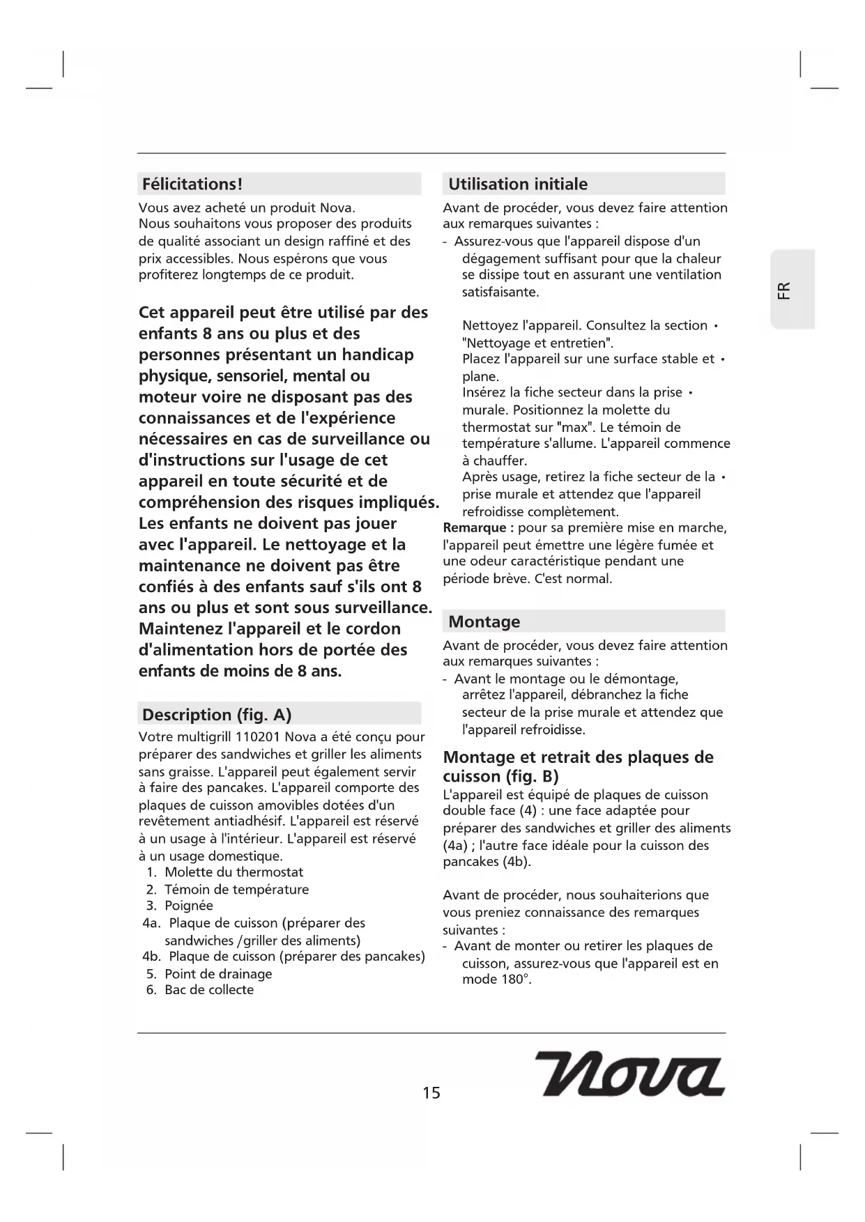 Félicitations! Vous avez acheté un produit Nova. Nous souhaitons vous proposer des produits de qualité associant un design raffiné et des prix accessibles. Nous espérons que vous profiterez longtemps de ce produit. Cet appareil peut être utilisé par des enfants 8 ans ou plus et des personnes présentant un handicap physique, sensoriel, mental ou moteur voire ne disposant pas des connaissances et de l'expérience nécessaires en cas de surveillance ou d'instructions sur l'usage de cet appareil en toute sécurité et de compréhension des risques impliqués. Les enfants ne doivent pas jouer avec l'appareil. Le nettoyage et la maintenance ne doivent pas être confiés à des enfants sauf s'ils ont 8 ans ou plus et sont sous surveillance. Maintenez l'appareil et le cordon d'alimentation hors de portée des enfants de moins de 8 ans. Description (fig. A) Votre multigrill 110201 Nova a été conçu pour préparer des sandwiches et griller les aliments sans graisse. L'appareil peut également servir à faire des pancakes. L'appareil comporte des plaques de cuisson amovibles dotées d'un revêtement antiadhésif. L'appareil est réservé à un usage à l'intérieur. L'appareil est réservé à un usage domestique.