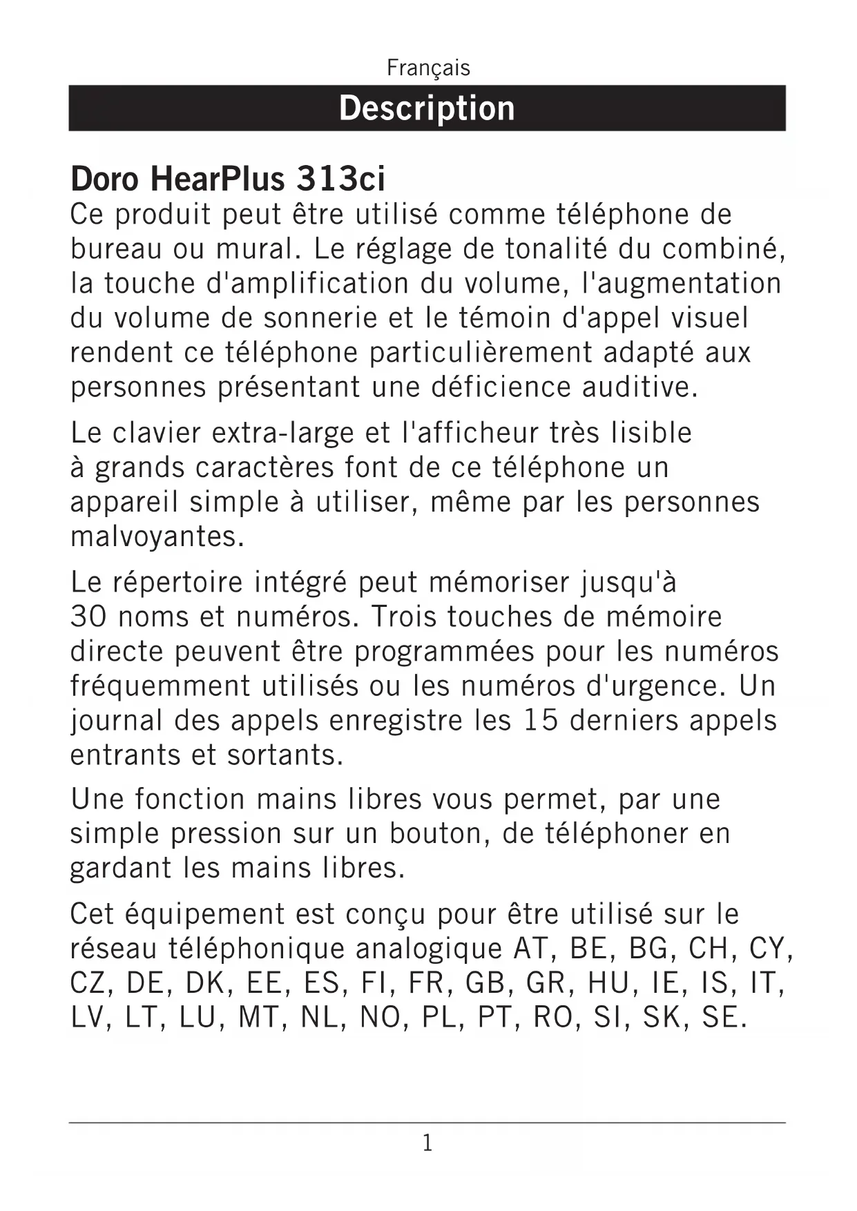 - L’adaptateur secteur sert de dispositif de sectionnement de l’alimentation 230 V. Il doit donc être installé, par précaution, près de l’appareil et être facilement accessible. Les recommandations ci-dessus s'appliquent à votre appareil ainsi qu'aux piles, au bloc d'alimentation et à tout autre accessoire. Si le téléphone ne fonctionne pas correctement, rapportez-le au S.A.V. de votre revendeur. N'oubliez pas de vous munir du ticket de caisse ou d'une copie de la facture.17 Français Garantie et données techniques Garantie et S.A.V. Pour la France Cet appareil est garanti deux ans à partir de sa date d’achat, la facture faisant foi. En cas de problèmes, contactez votre revendeur. La réparation dans le cadre de cette garantie sera effectuée gratuitement. La garantie est valable pour un usage normal de l’appareil tel qu’il est déni dans la notice d’utilisation. Les fournitures utilisées avec l’appareil ne sont pas couvertes par la garantie. Sont exclues de cette garantie les détériorations dues à une cause étrangère à l’appareil. Les dommages dus à des manipulations ou à un emploi non conformes, à un montage ou entreposage dans de mauvaises conditions, à un branchement ou une installation non-conformes ne sont pas pris en charge par la garantie. Par ailleurs, la garantie ne s’appliquera pas si l’appareil a été endommagé à la suite d’un choc ou d’une chute, d’une fausse manoeuvre, d’un branchement non-conforme aux instructions mentionnées dans la notice, de l’effet de la foudre, de surtensions électriques ou électrostatiques, d’une protection insufsante contre l’humidité, la chaleur ou le gel. En tout état de cause, la garantie légale pour vices cachés s’appliquera conformément aux articles 1641 et suivants du Code Civil. En tant que consommables, les piles sont exclues de la garantie. N'utilisez que des piles alcalines AA de bonne qualité. REMARQUE Cette Garantie n’affecte pas les droits dont vous jouissez au titre des lois en vigueur dans votre pays relatives à la vente des produits de consommation. Spécications Dimensions : 175 mm x 175 mm x 60 mm Poids : 750 g (avec piles) Piles : 4 piles alcalines 1,5 V AA Déclaration de conformité Doro certie que cet appareil Doro HearPlus 313ci est compatible avec l'essentiel des spécications requises et autres points des directives 1999/5/CE (R&TTE) et 2002/95/CE (RoHS). Une copie de la déclaration de conformité du fabricant peut être consultée sur www.doro.com/dofc18 Français1 Español Descripción HearPlus 313ci de Doro Este producto puede utilizarse como teléfono de sobremesa o montado en la pared. El control del tono del auricular, la amplificación del volumen, el volumen de señal mejorado y la indicación visual de llamada hacen que este teléfono sea apto para personas con dificultades auditivas. El teclado extragrande y la pantalla fácil de leer con grandes caracteres facilitan el uso del teléfono, incluso si se sufren problemas de visión. La guía integrada puede almacenar hasta 30 nombres y números. Pueden programarse tres teclas de memoria de marcación directa para los números de emergencia o los números que se usan con más frecuencia. La memoria de llamadas almacena las 15 llamadas entrantes y salientes más recientes. La función de altavoz le permite hablar en modo de manos libres con solo pulsar una tecla. Este equipo está diseñado para uso únicamente en las redes telefónicas analógicas de AT, BE, BG, CH, CY, CZ, DE, DK, EE, ES, FI, FR, GB, GR, HU, IE, IS, IT, LV, LT, LU, MT, NL, NO, PL, PT, RO, SI, SK, SE.2 Español Instalación Conexión