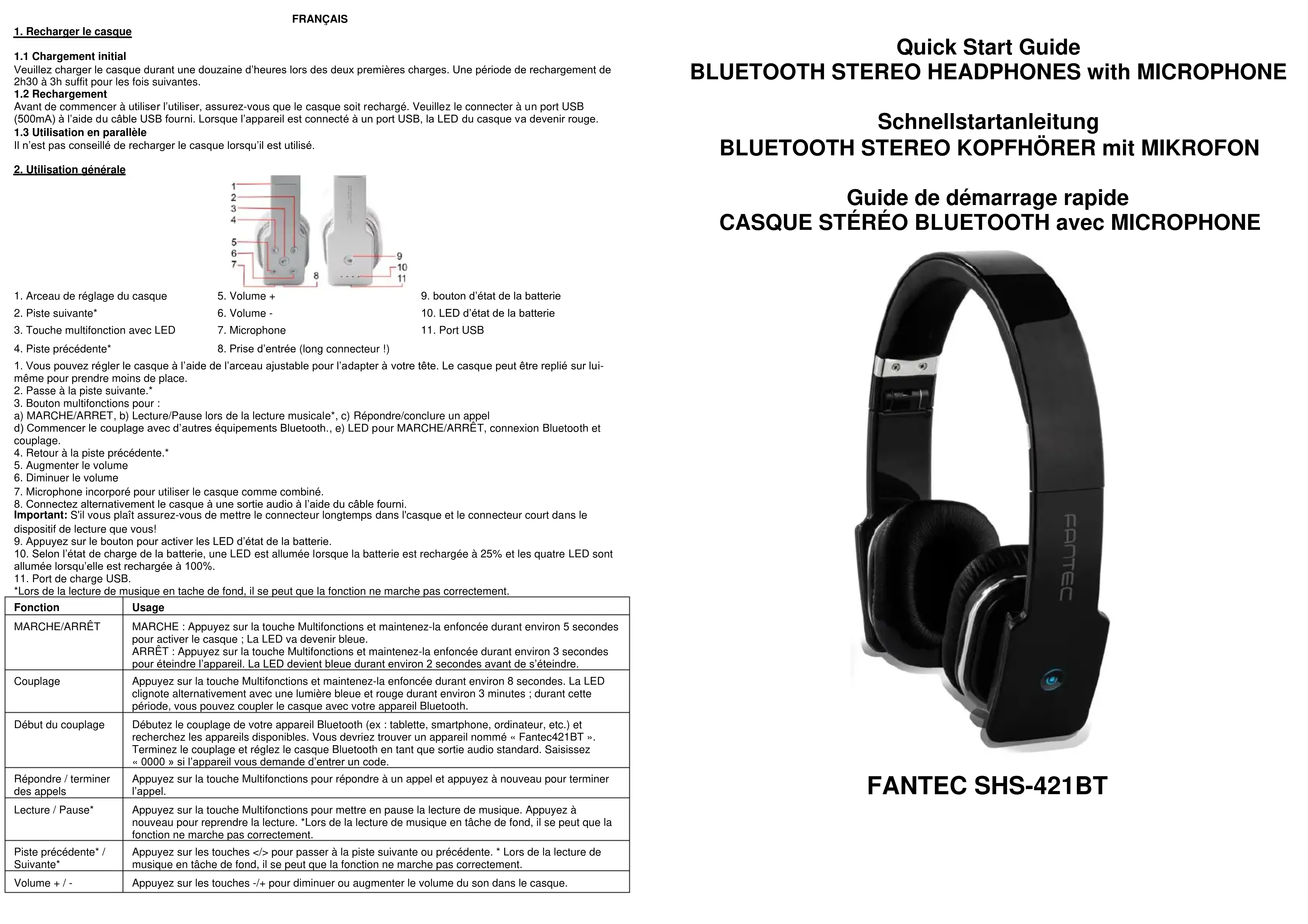MARCHE : Appuyez sur la touche Multifonctions et maintenez-la enfoncée durant environ 5 secondes pour activer le casque ; La LED va devenir bleue. ARRÊT : Appuyez sur la touche Multifonctions et maintenez-la enfoncée durant environ 3 secondes pour éteindre l’appareil. La LED devient bleue durant environ 2 secondes avant de s’éteindre. Couplage Appuyez sur la touche Multifonctions et maintenez-la enfoncée durant environ 8 secondes. La LED clignote alternativement avec une lumière bleue et rouge durant environ 3 minutes ; durant cette période, vous pouvez coupler le casque avec votre appareil Bluetooth. Début du couplage Débutez le couplage de votre appareil Bluetooth (ex : tablette, smartphone, ordinateur, etc.) et recherchez les appareils disponibles. Vous devriez trouver un appareil nommé « Fantec421BT ». Terminez le couplage et réglez le casque Bluetooth en tant que sortie audio standard. Saisissez « 0000 » si l’appareil vous demande d’entrer un code. Répondre / terminer des appels Appuyez sur la touche Multifonctions pour répondre à un appel et appuyez à nouveau pour terminer l’appel. Lecture / Pause* Appuyez sur la touche Multifonctions pour mettre en pause la lecture de musique. Appuyez à nouveau pour reprendre la lecture. *Lors de la lecture de musique en tâche de fond, il se peut que la fonction ne marche pas correctement. Piste précédente* / Suivante* Appuyez sur les touches </> pour passer à la piste suivante ou précédente. * Lors de la lecture de musique en tâche de fond, il se peut que la fonction ne marche pas correctement. Volume + / - Appuyez sur les touches -/+ pour diminuer ou augmenter le volume du son dans le casque.