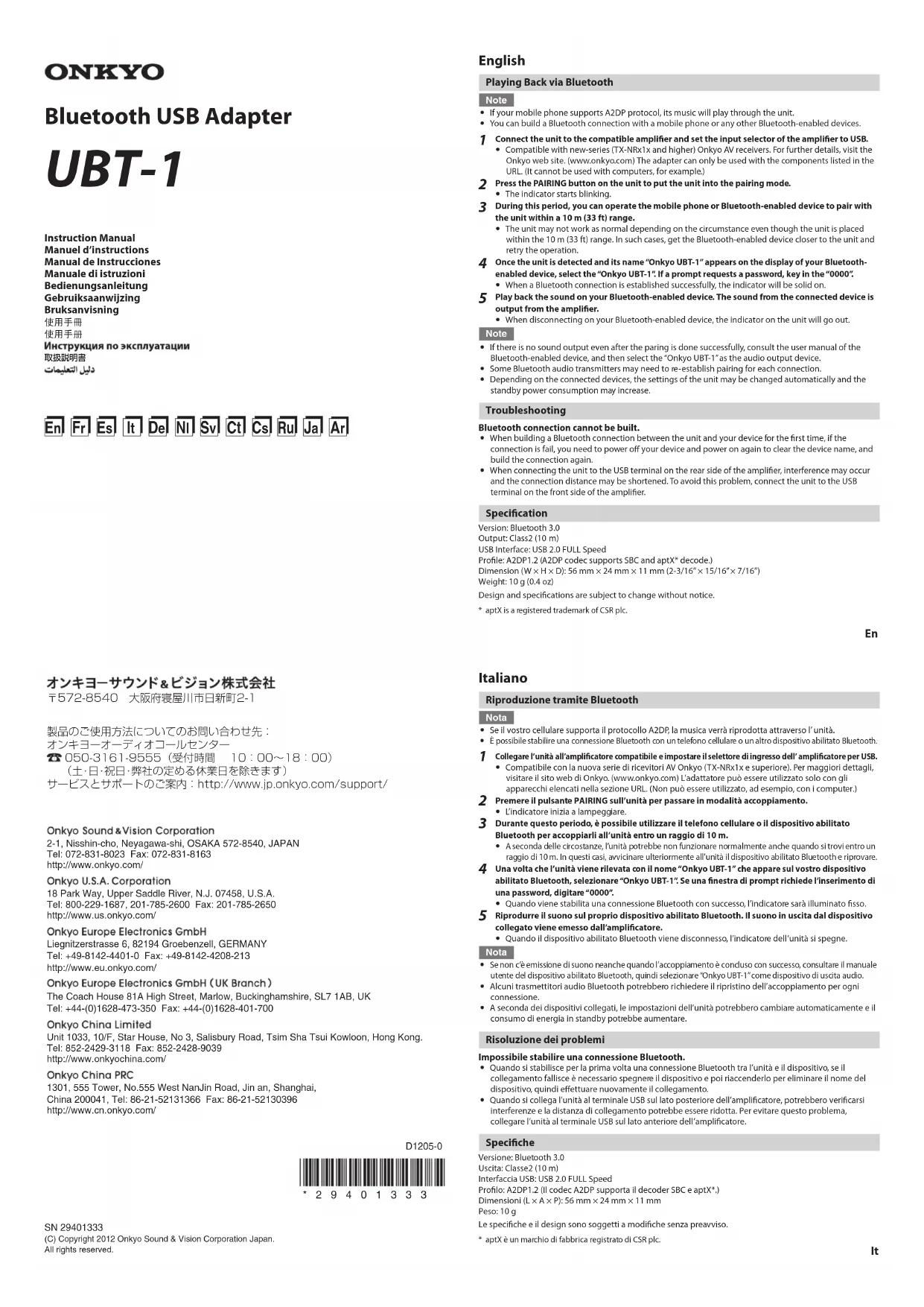 Retrouvez gratuitement la notice de l'appareil UBT1B ONKYO au format PDF.