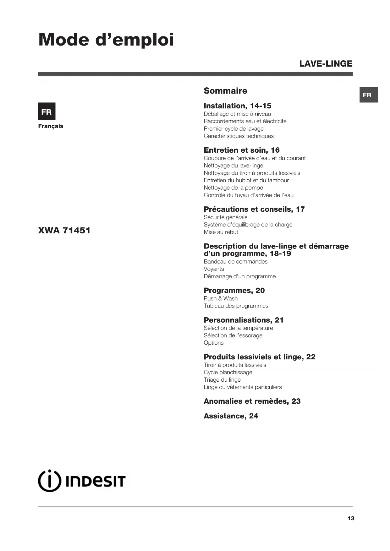 MODE D'EMPLOI XWA 71451 WB INDESIT