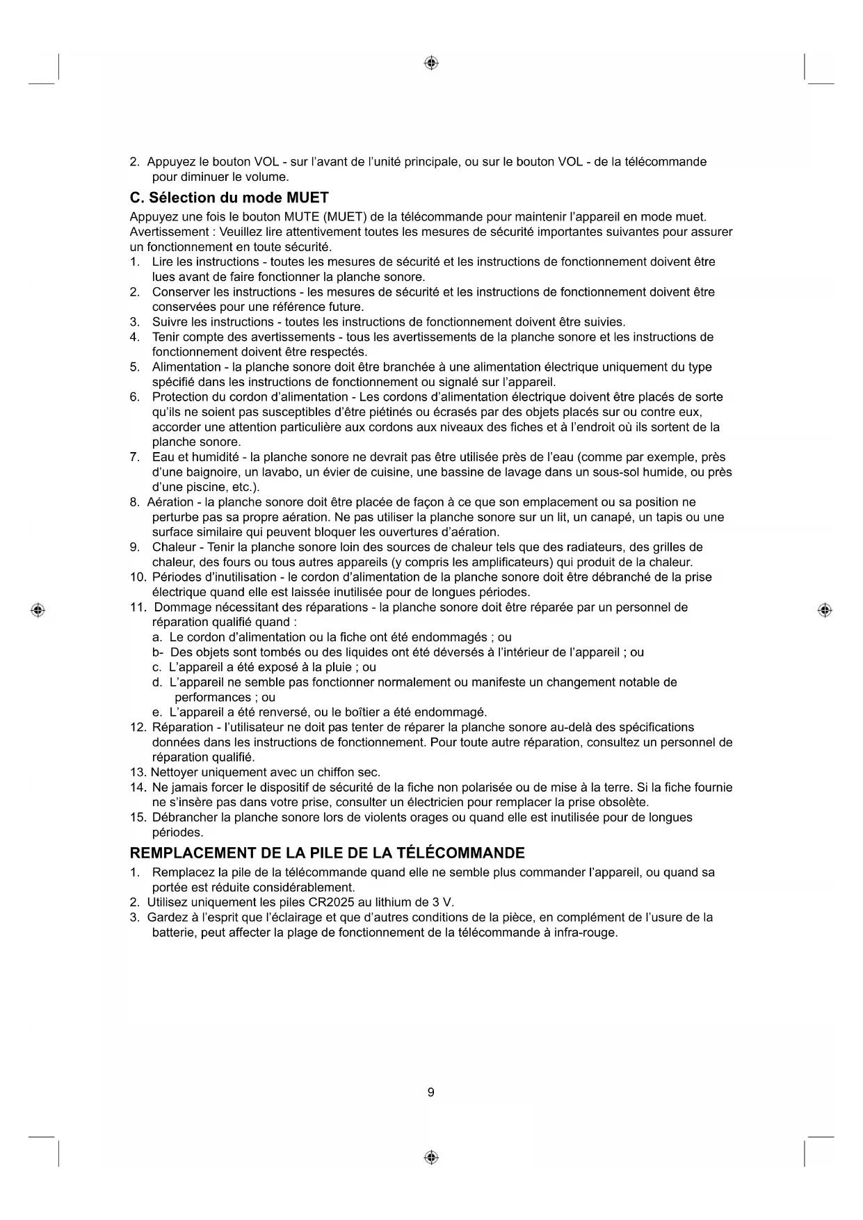 Réparation - l'utilisateur ne doit pas tenter de réparer la planche sonore au-delà des specifications données dans les instructions de fonctionnement. Pour toute autre réparation, consultez un personnel de réparation qualifié.