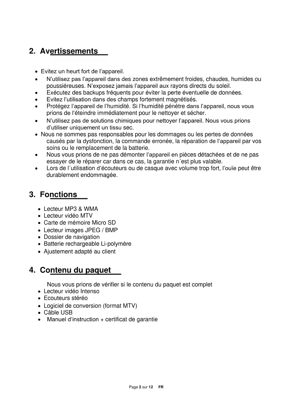 Nous vous prions de vérifier si le contenu du paquet est complet Lecteur vidéo Intenso Ecouteurs stéréo Logiciel de conversion (format MTV) Câble USB Manuel d‘instruction + certificat de garantiePage 3 sur 12 FR